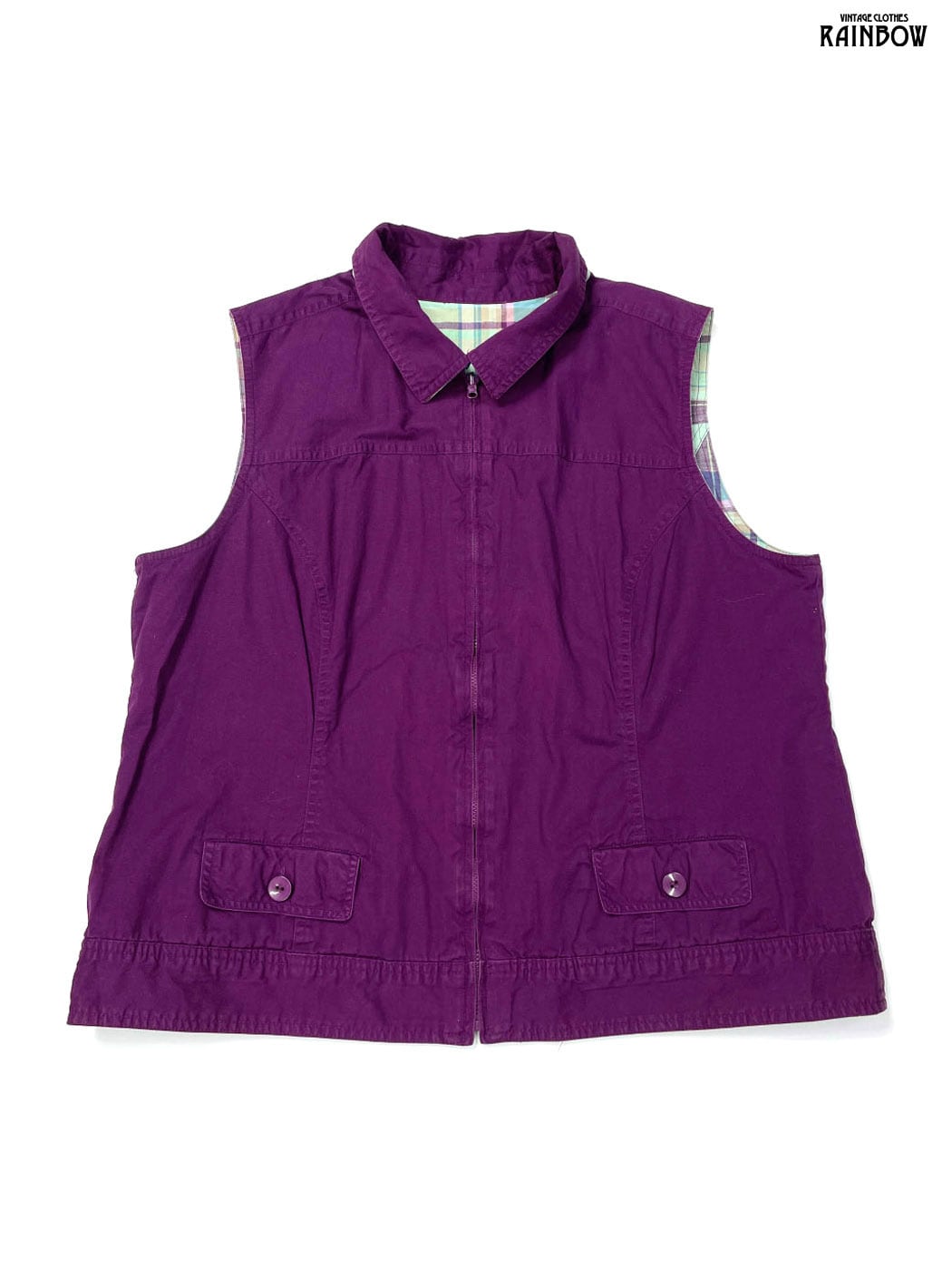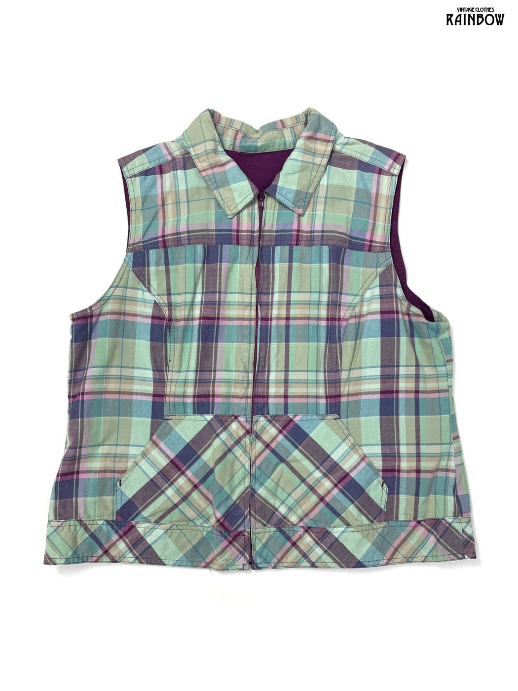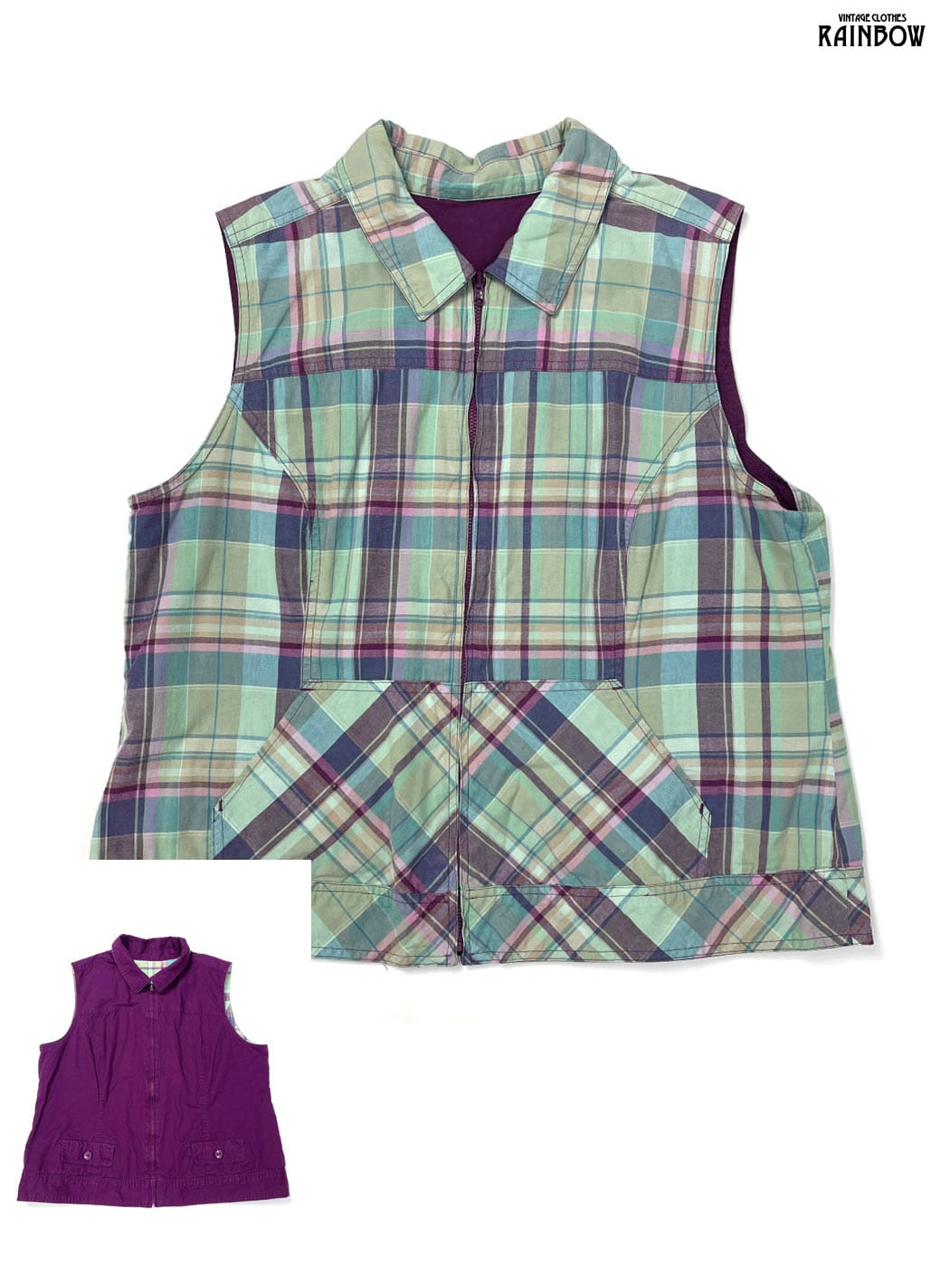 古着 リバーシブル チェック柄 無地 コットン ノースリーブ ベスト ライトグリーン 紫 (ttu2603115)