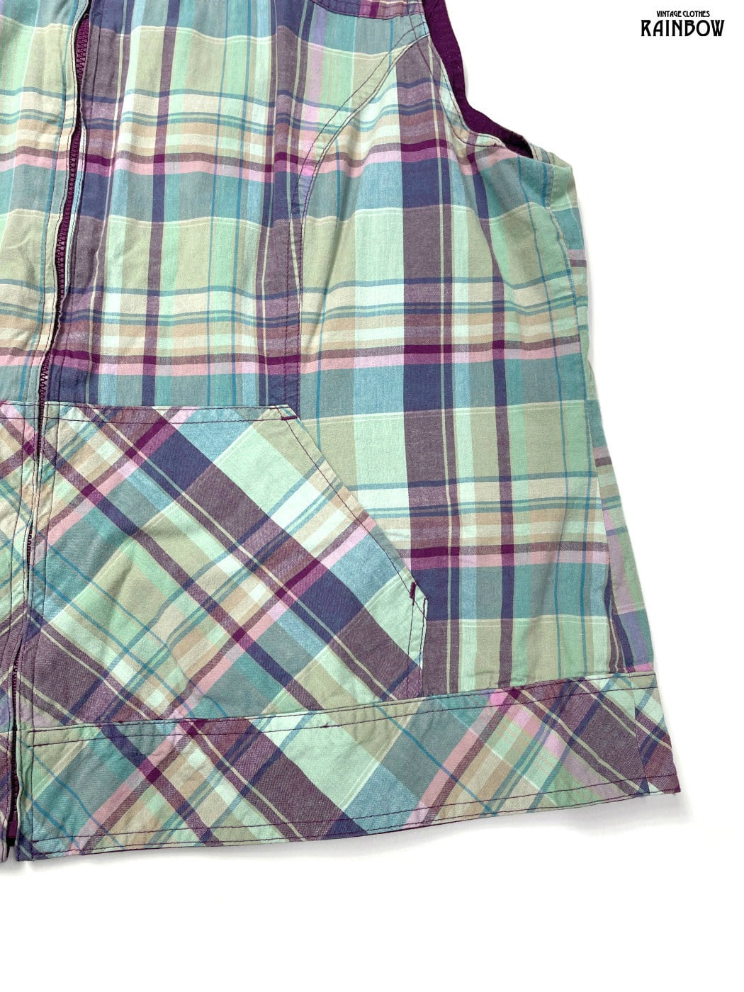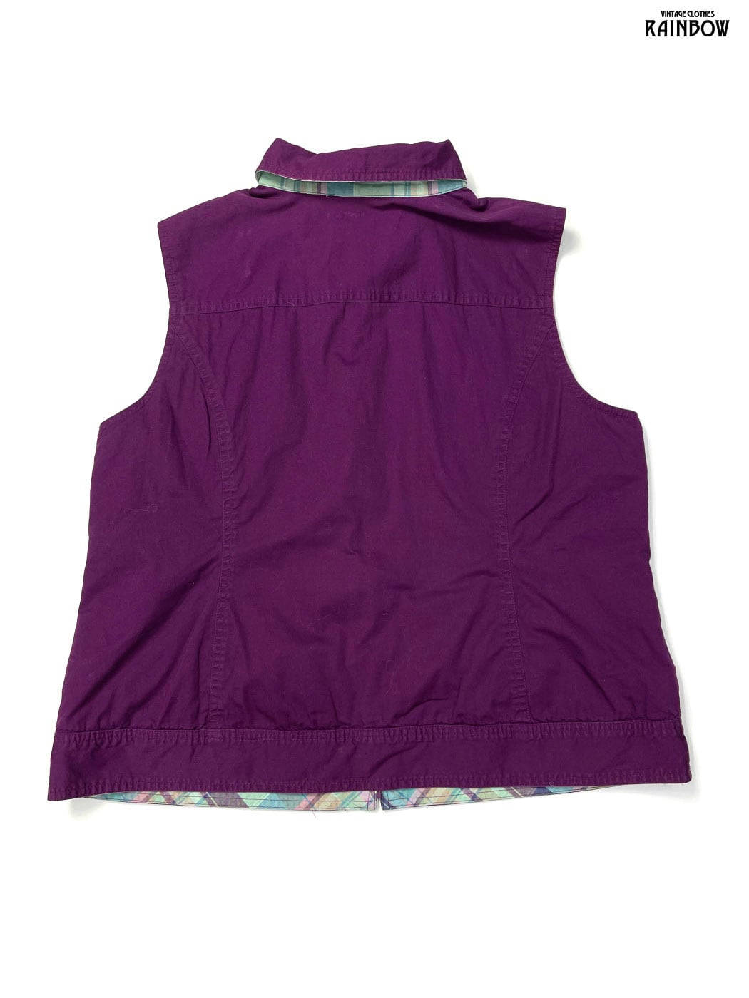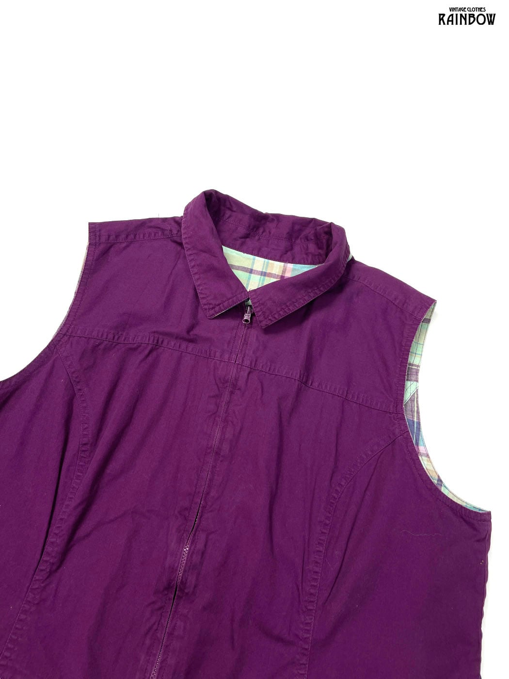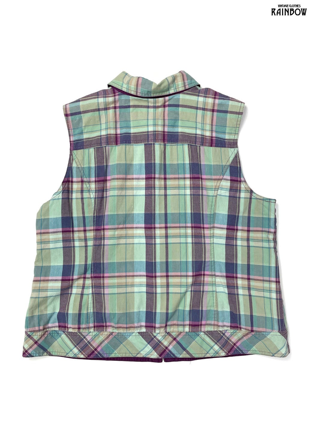 古着 リバーシブル チェック柄 無地 コットン ノースリーブ ベスト ライトグリーン 紫 (ttu2603115)