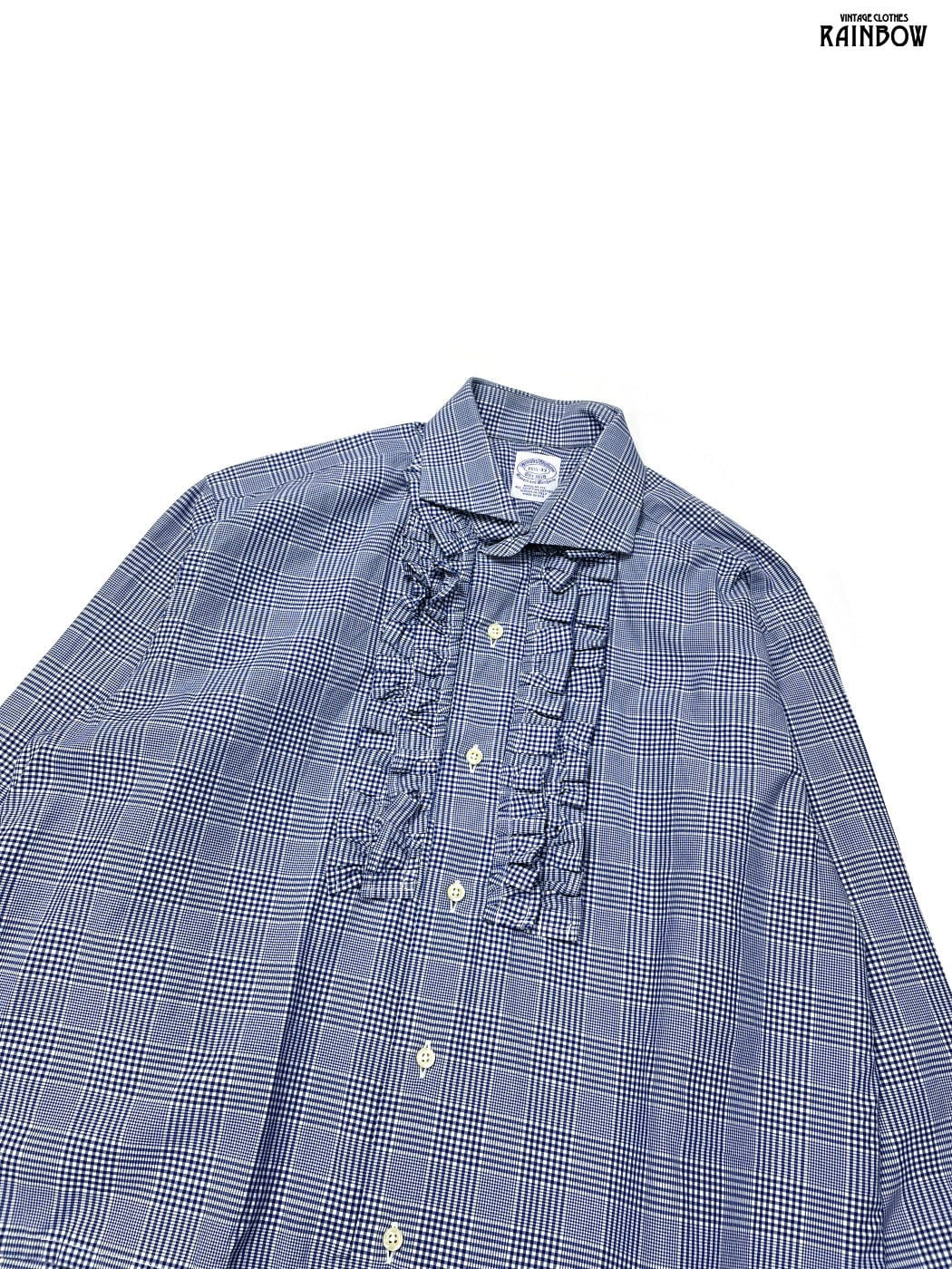 古着 Brooks Brothers ブルックスブラザーズ アメリカ製 フリル ギンガムチェック柄 コットン 長袖 ブラウス 青 (ttu2603116)