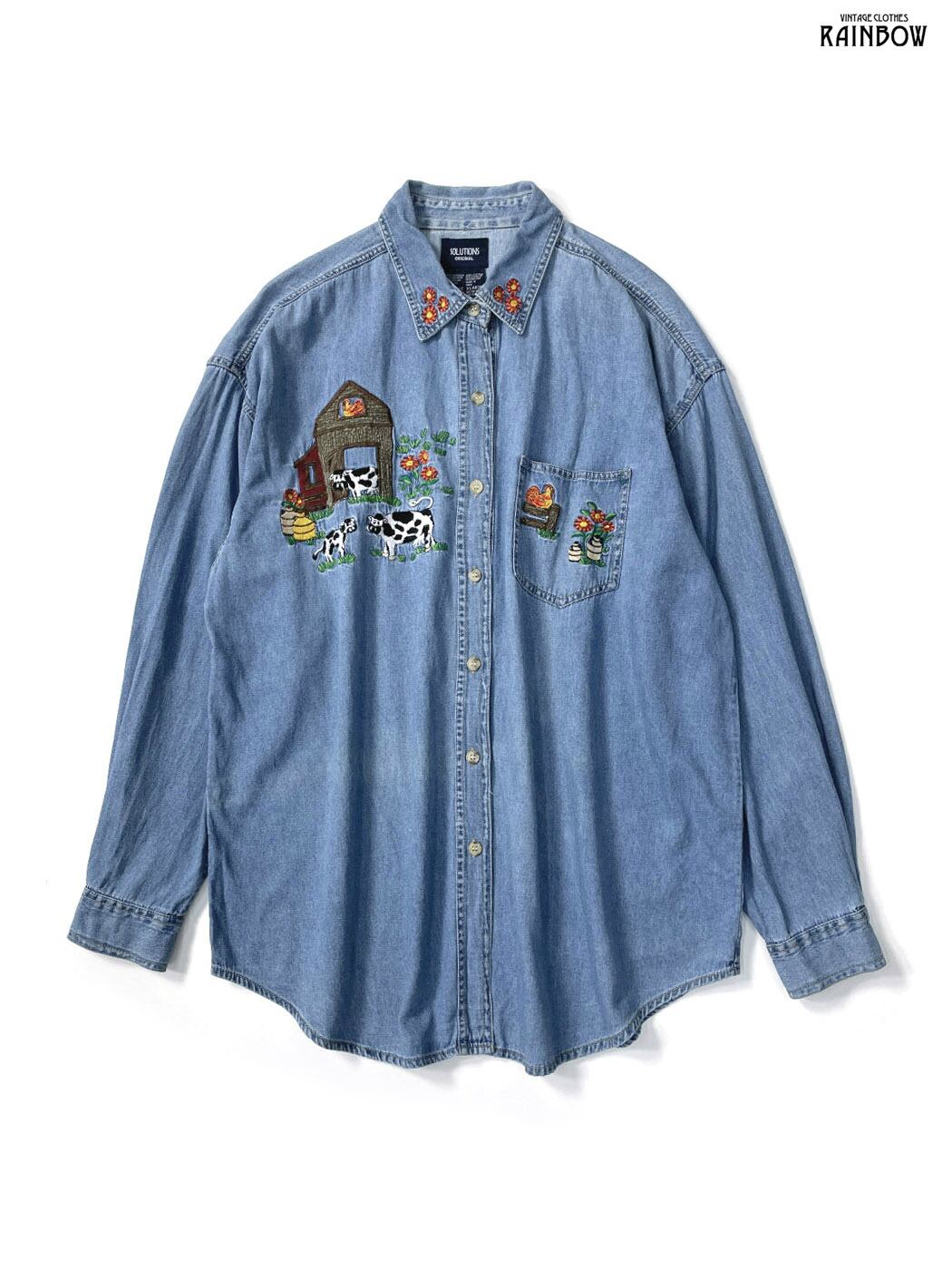 #ブラウス #シャツ #ロングスリーブ #青 #水色 #無地 #アニマル 牛 #刺繍 #前開き #ヴィンテージ #デニム #デニムシャツ