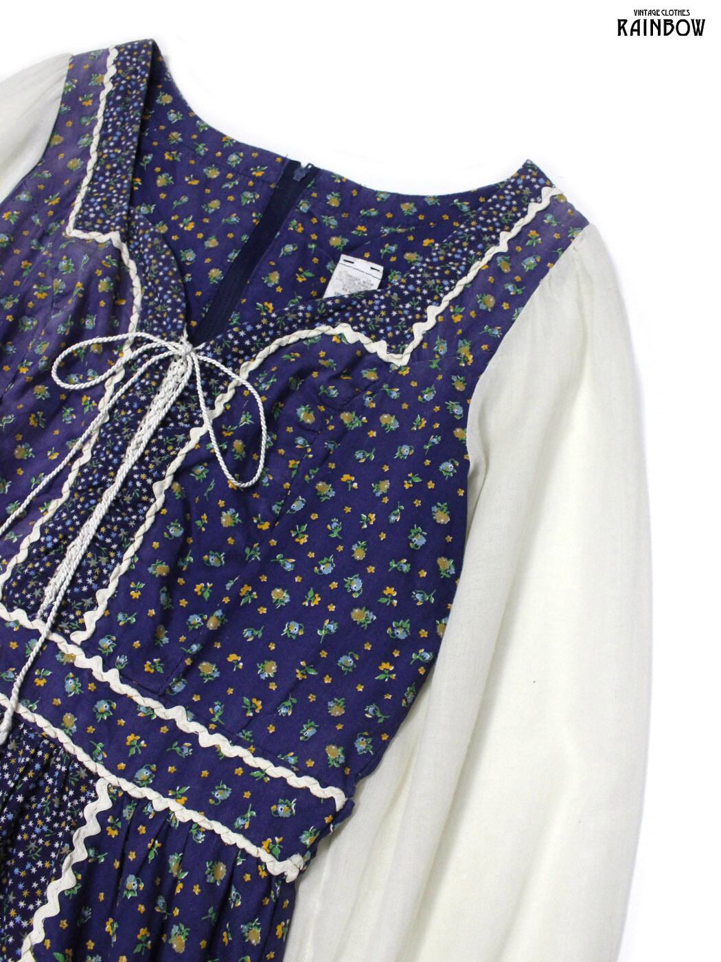 #ワンピース #ロングスリーブ #ロング丈 #フレア#ウエスト切り替え #紺 #花柄 #リボン #ガーリー #コットン #長袖花柄ワンピース