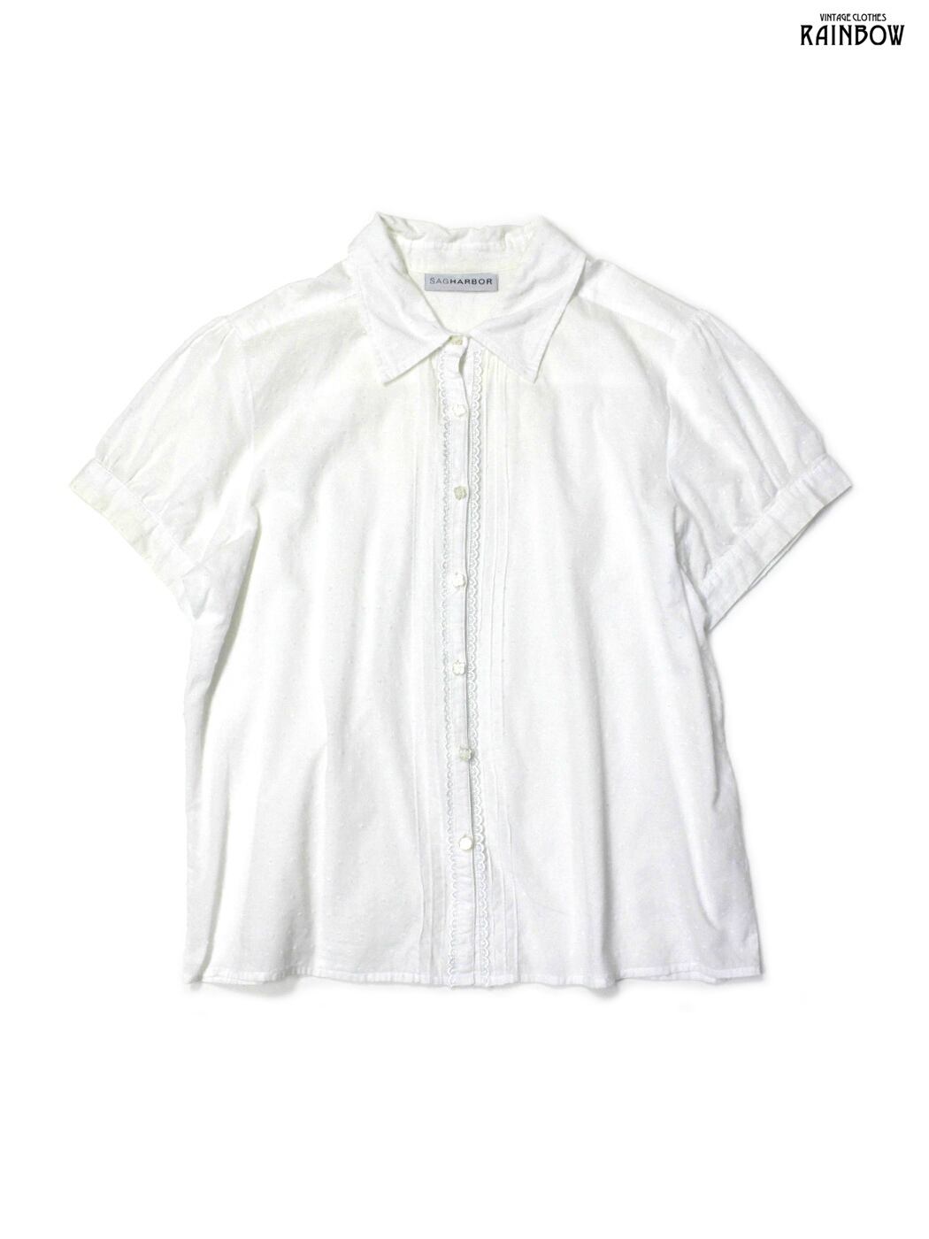 #ブラウス #シャツ #ハーフスリーブ #白 #ドット柄 #レース #前開き パフスリーブ #ガーリー #コットン #半袖ドット柄ブラウス
