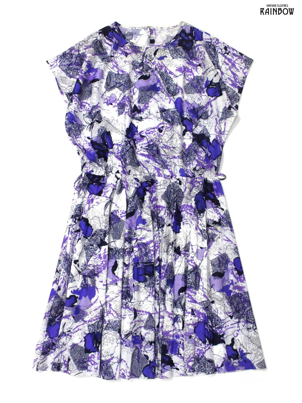 #ワンピース #ハーフスリーブ #膝丈 #ウエスト切り替え #紫 #総柄 #コットン #半袖総柄ワンピース