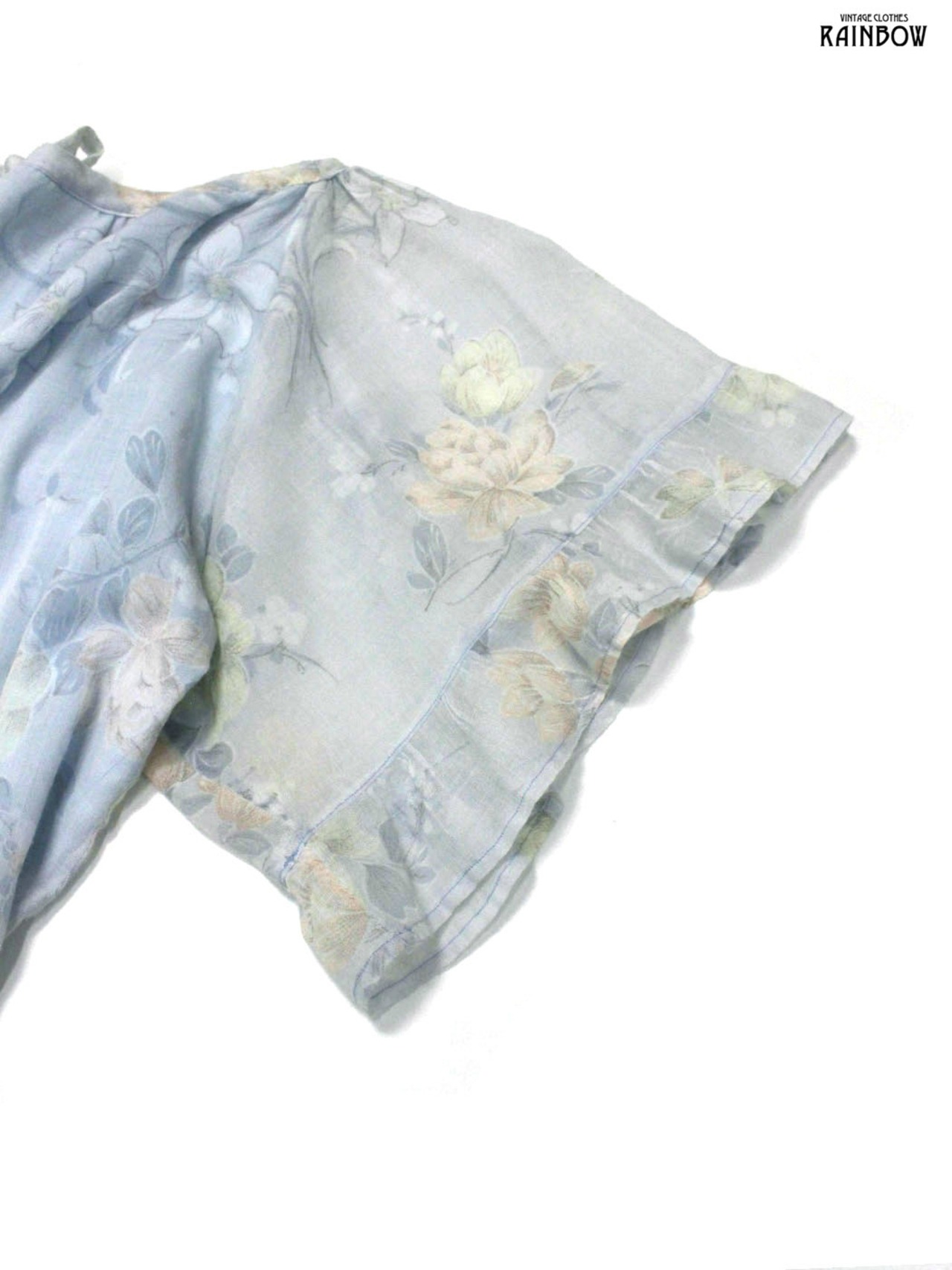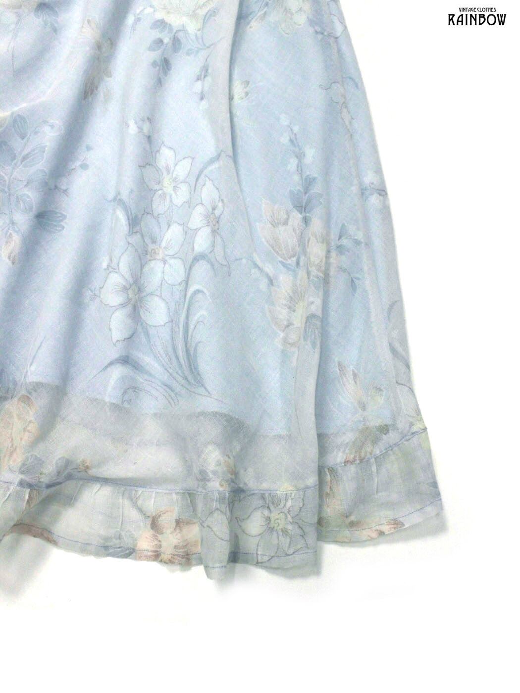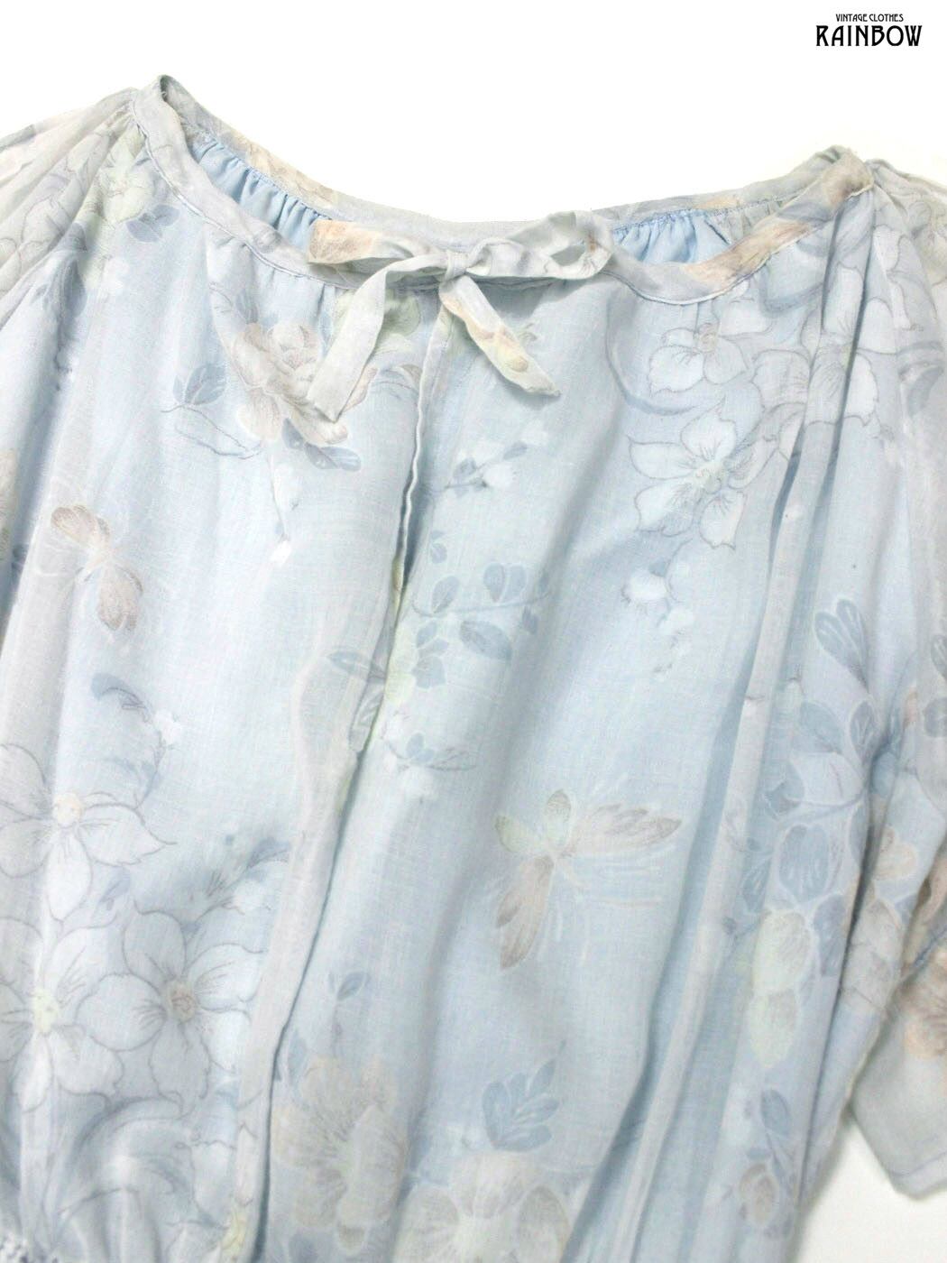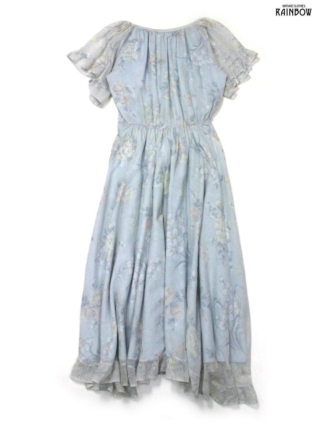 #ワンピース #ハーフスリーブ #ロング丈 #フレア #ゴムウエスト #ウエスト切り替え #青 #水色 #花柄 #フリル #リボン #フリル袖 #ガーリー #コットン #半袖花柄ワンピース#シアー