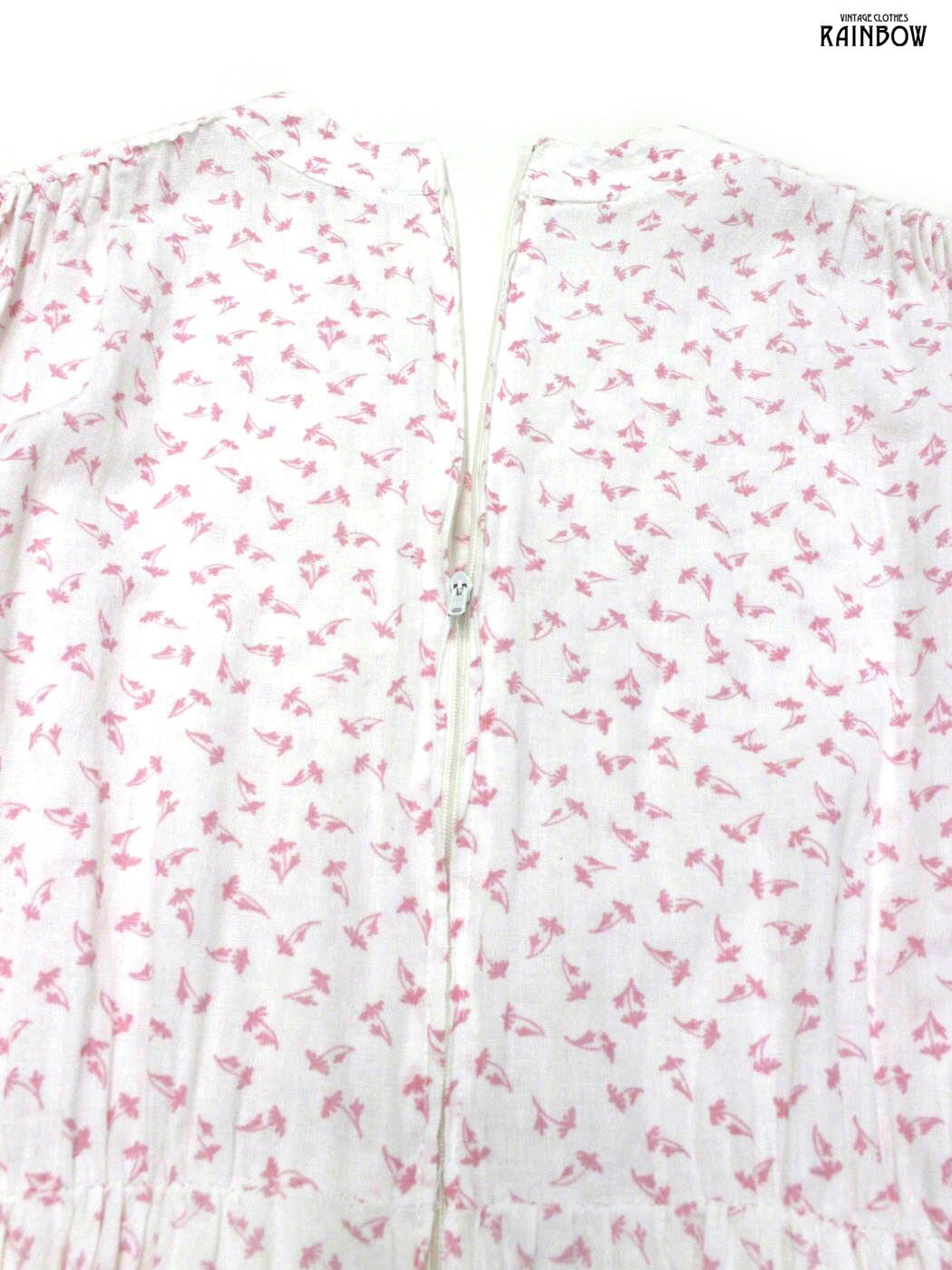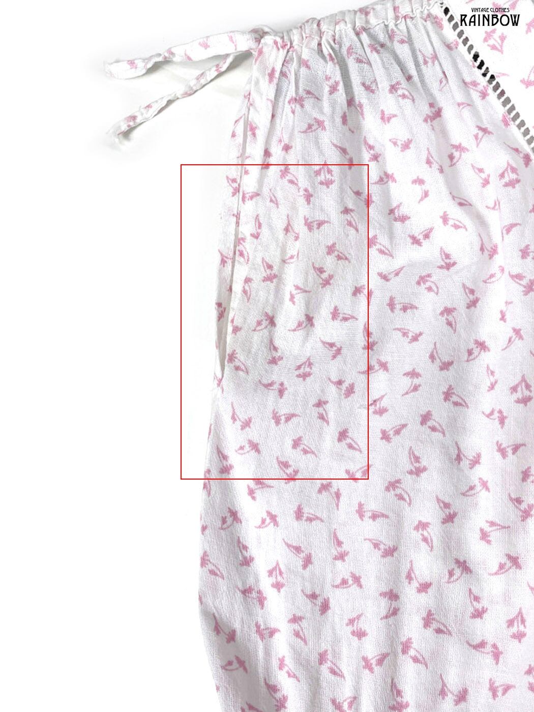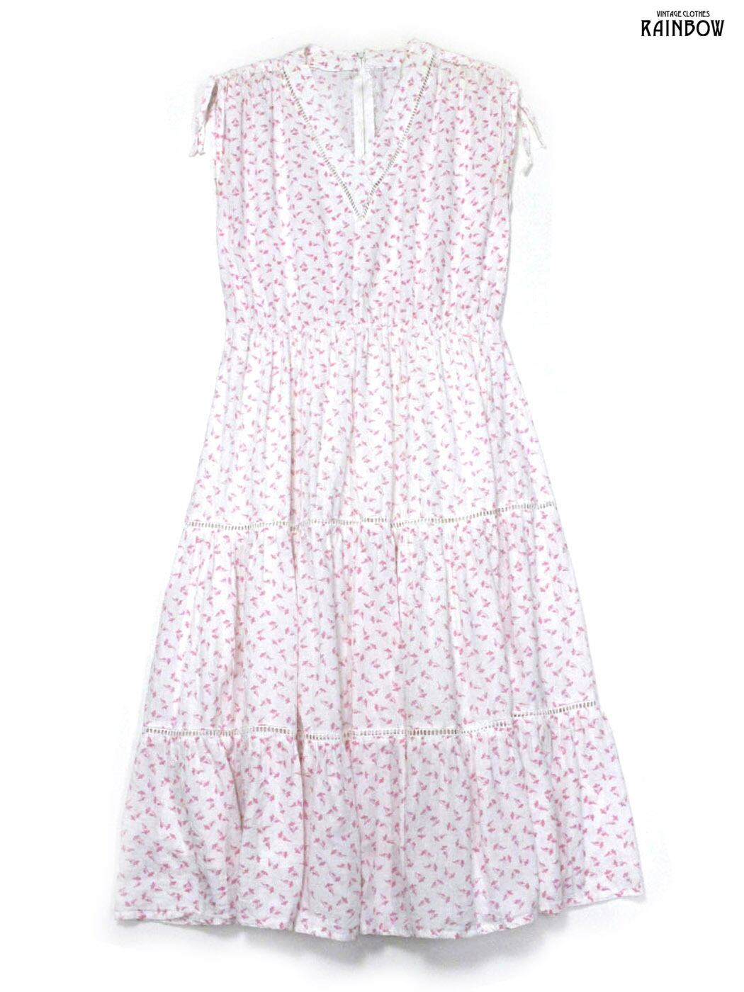 古着 肩シャーリング はしごレース リボン 花柄 コットン ロング丈 ノースリーブ ティアード ワンピース 白 ピンク (otu2405090)