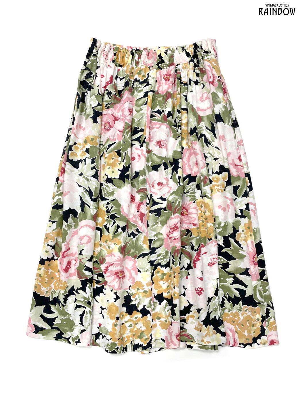 #スカート #膝丈 #フレア #ゴムウエスト #黒 #ピンク #花柄 #アメリカ製 #ガーリー #クラシック #レーヨン #花柄ライトスカート