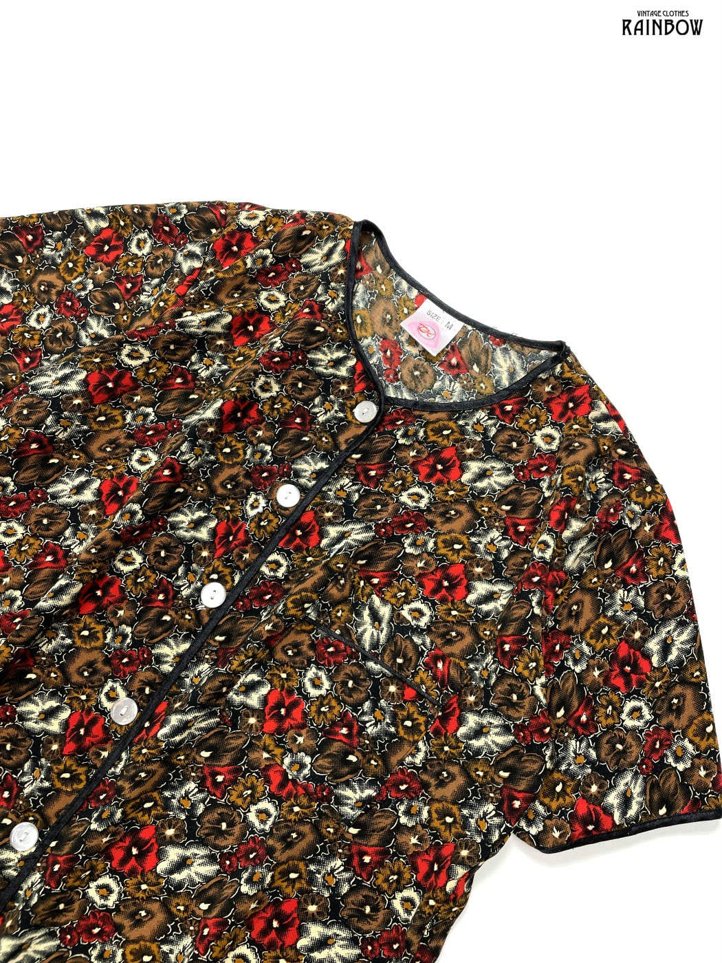 #ブラウス #bブラウス #ハーフスリーブ #赤 #茶 #花柄 #前開き #パイピング #クラシック #半袖柄ブラウス