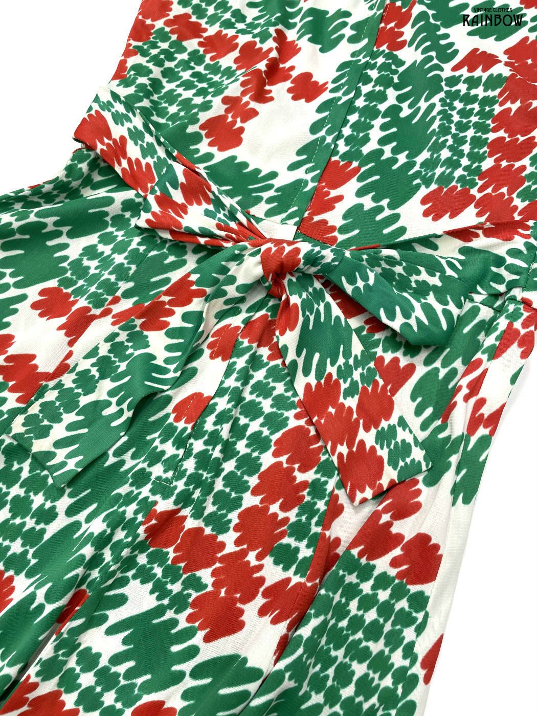 #ワンピース #ノースリーブ #膝丈 #ウエスト切り替え #青 #総柄 #リボン #半袖総柄ワンピース