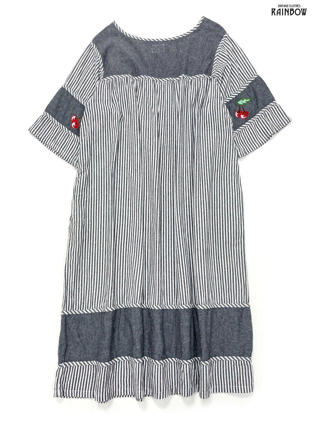 #ワンピース #ハーフスリーブ #ロング丈 #グレー #ストライプ柄 さくらんぼ #刺繍 #ガーリー #コットン #半袖ストライプ柄ワンピース