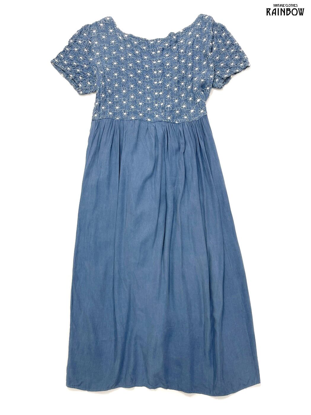 #ワンピース #ハーフスリーブ #ロング丈 #ウエスト切り替え #青 #アメリカ製 #刺繍 #レーヨン #刺繍ワンピース