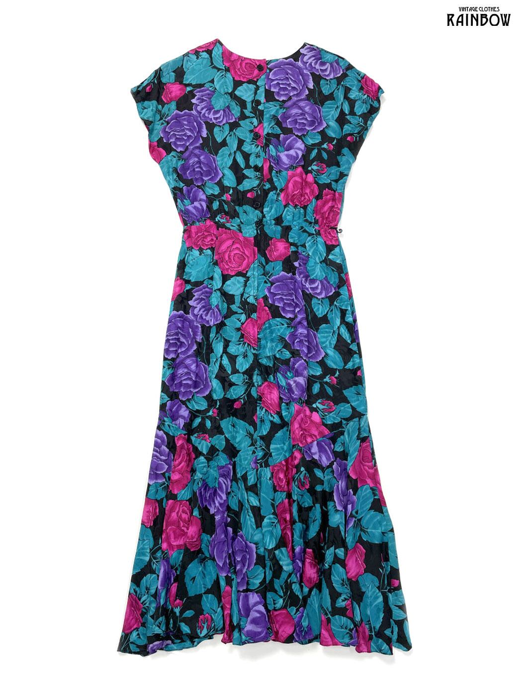 #ワンピース #ハーフスリーブ #ロング丈 #フレア #ウエスト切り替え #ピンク #緑 #紫 #花柄 #クラシック #シルク #シルクワンピース #フレンチスリーブ