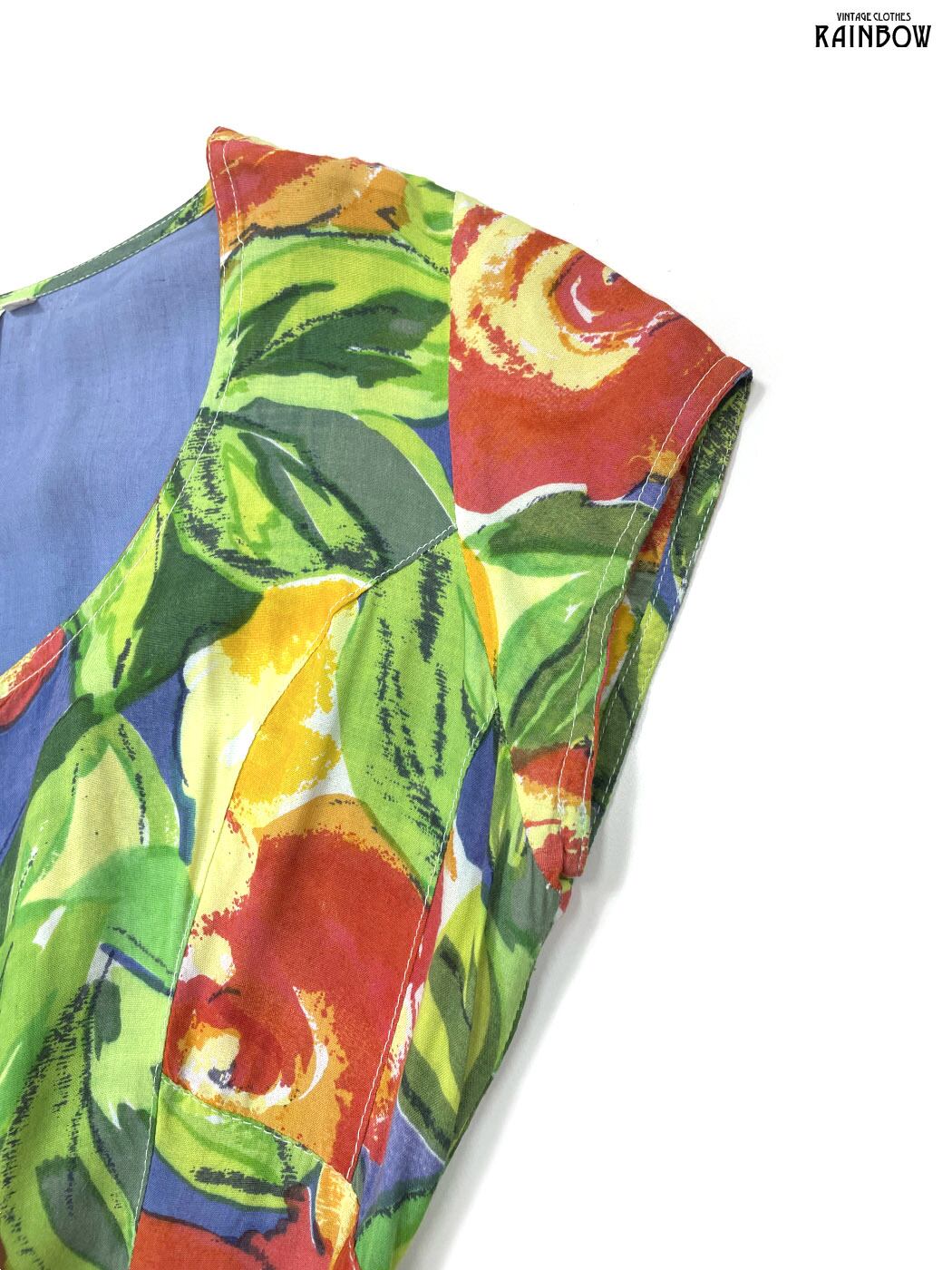 #ワンピース #ハーフスリーブ #ロング丈 #フレア #オレンジ #緑 #花柄 #リボン #シェルボタン #フレンチスリーブ #ガーリー #半袖花柄ワンピース