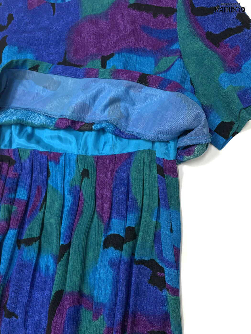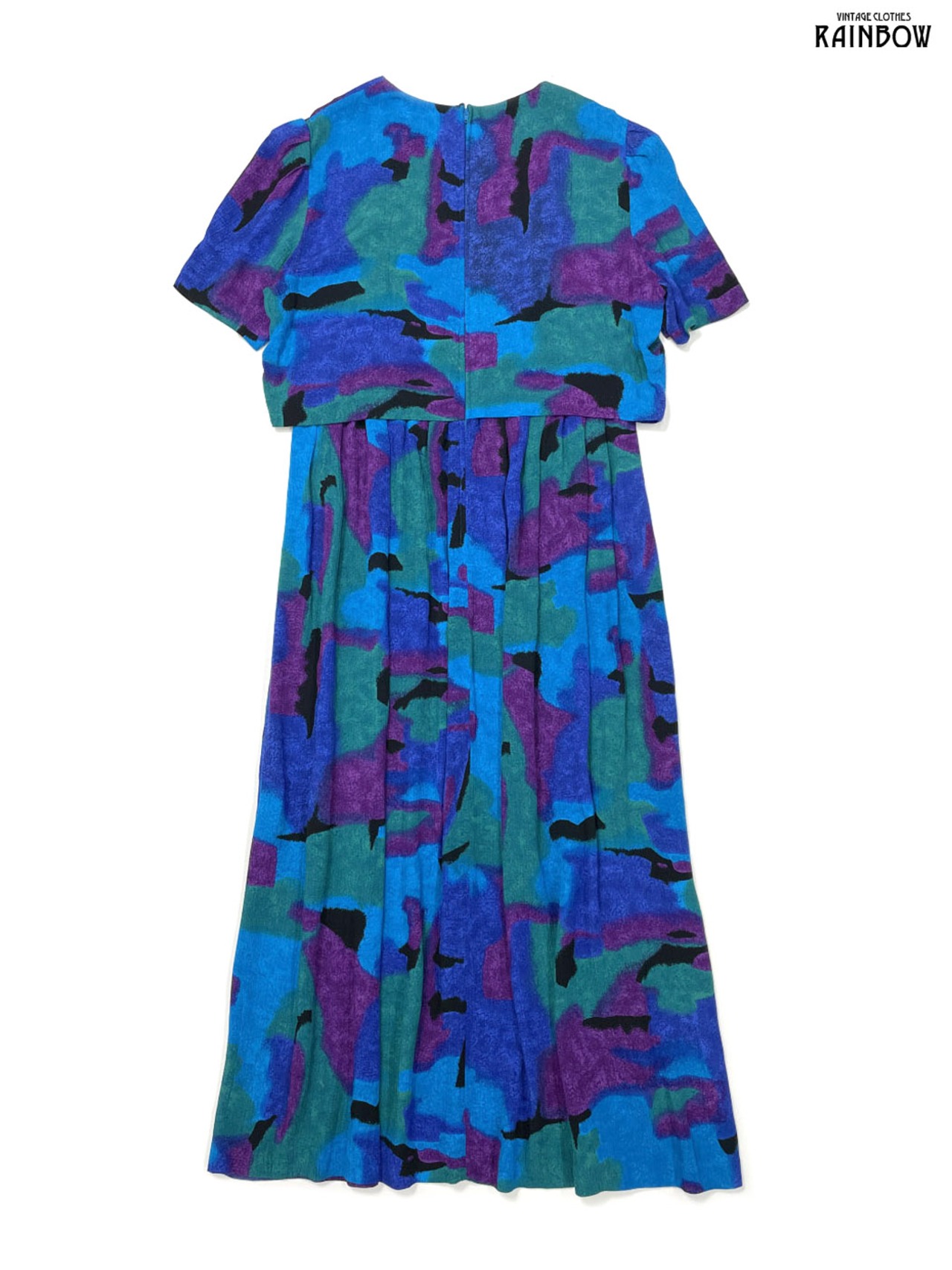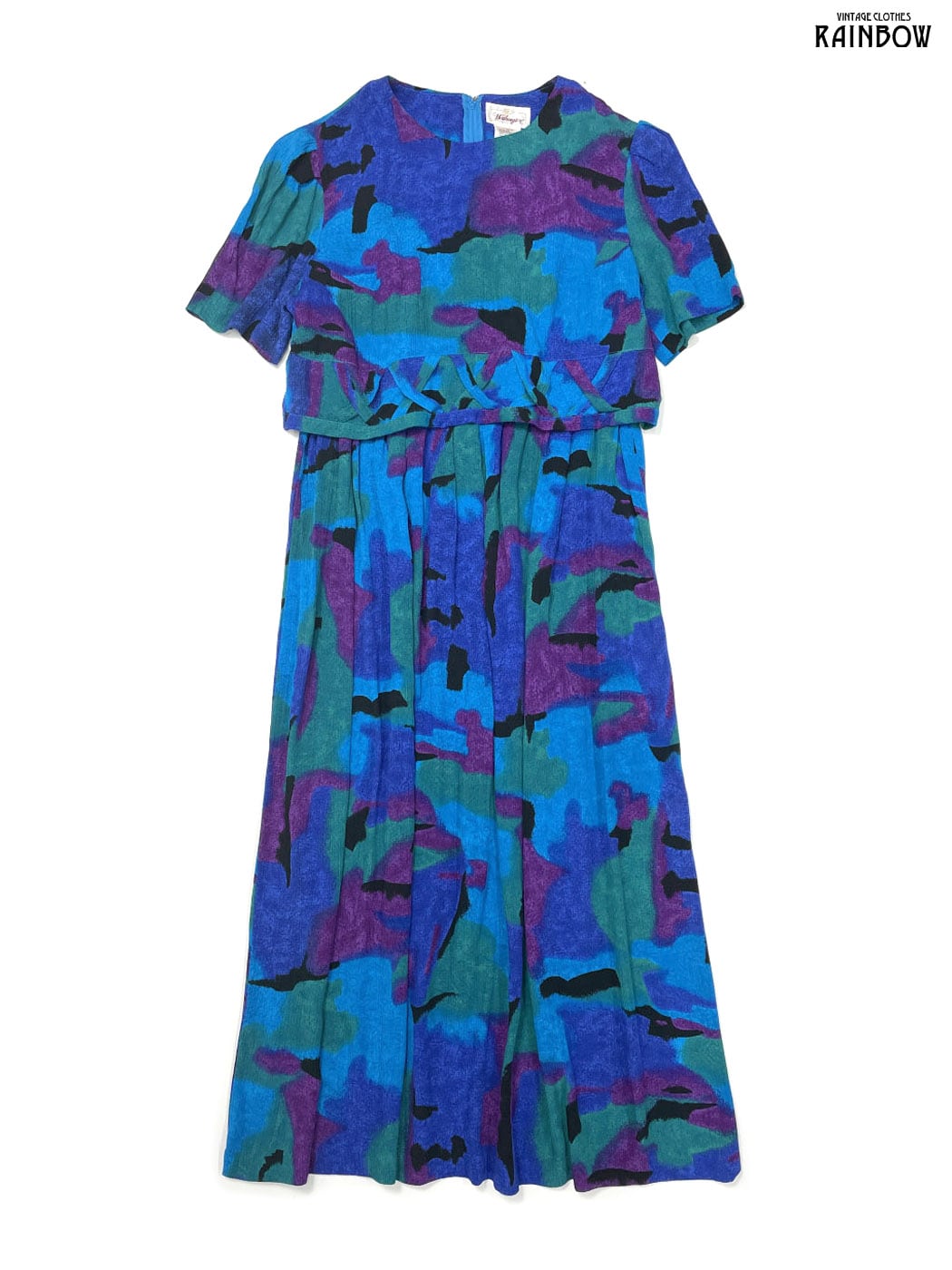 #ワンピース #ハーフスリーブ #ロング丈 #フレア #ウエスト切り替え #青 #紫 #総柄 #レイヤード風 #セットアップ風 #パフスリーブ #クラシック #レーヨン #半袖総柄ワンピース
