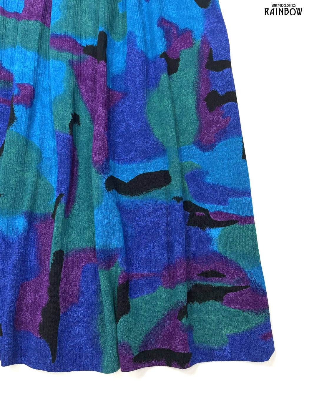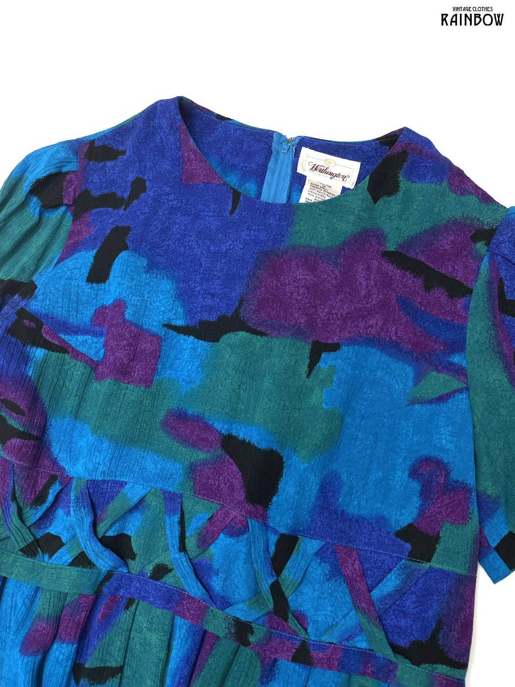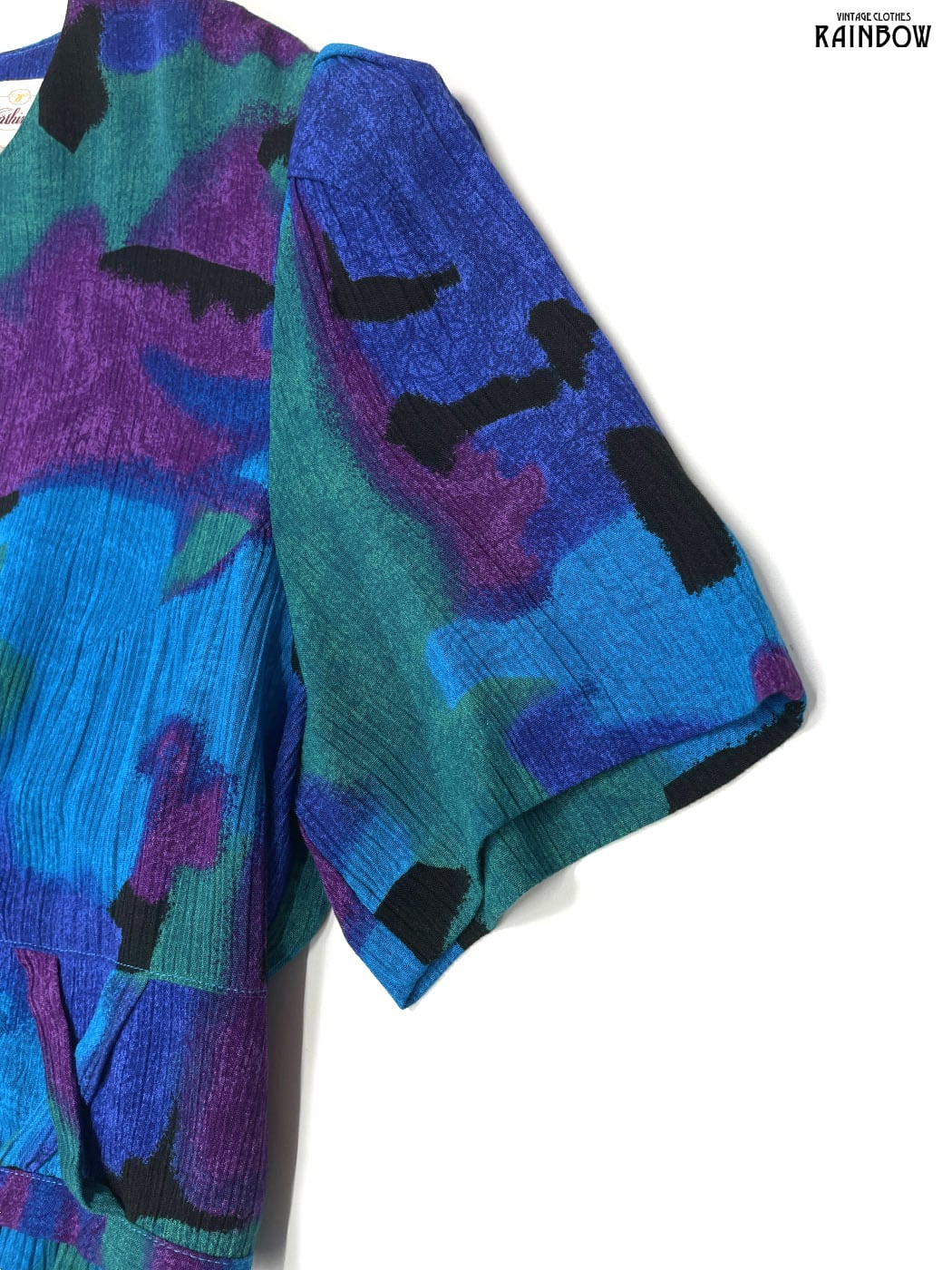 #ワンピース #ハーフスリーブ #ロング丈 #フレア #ウエスト切り替え #青 #紫 #総柄 #レイヤード風 #セットアップ風 #パフスリーブ #クラシック #レーヨン #半袖総柄ワンピース