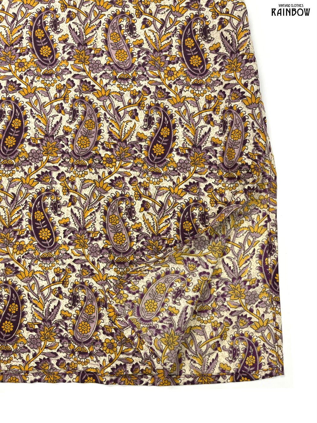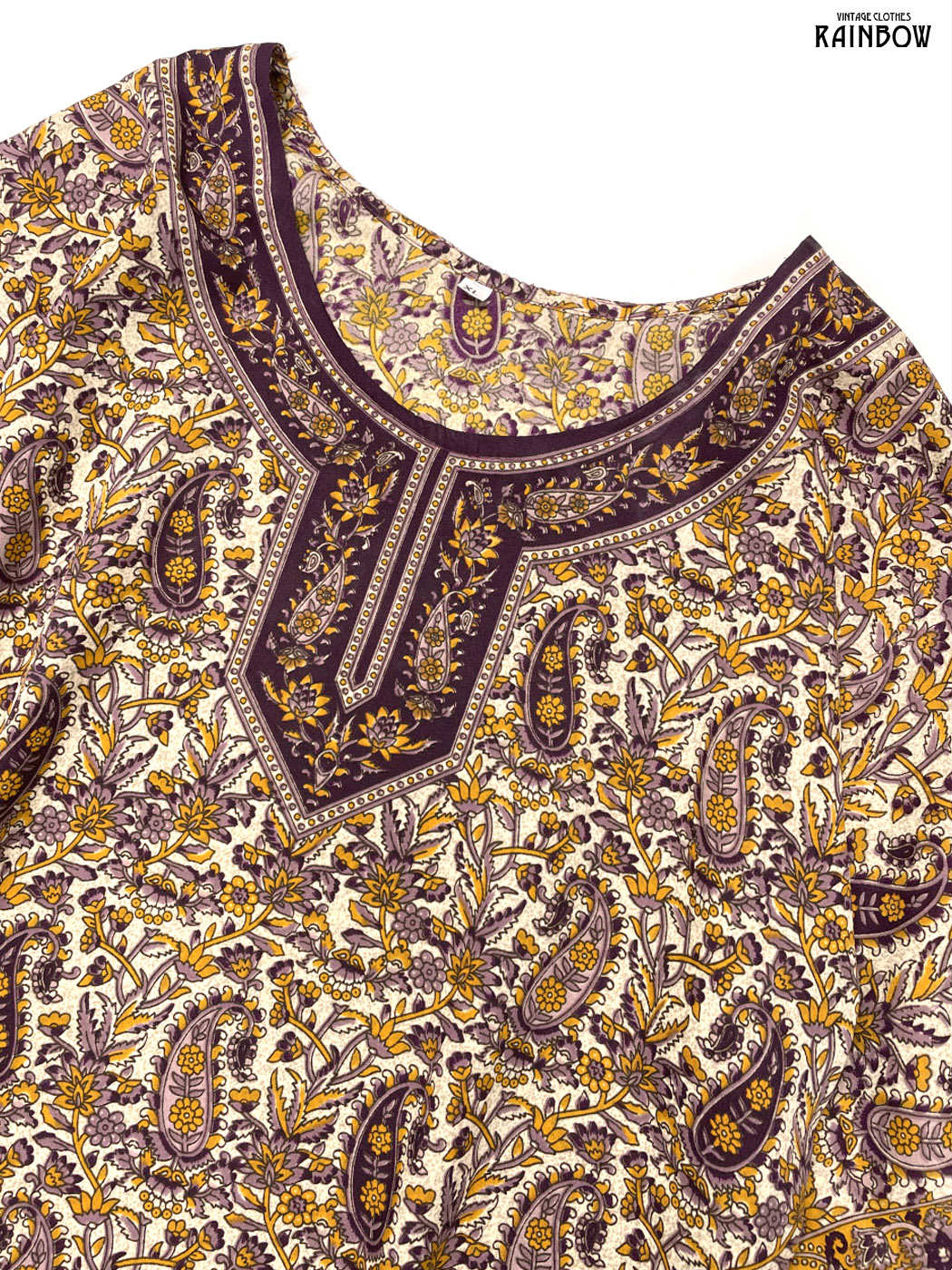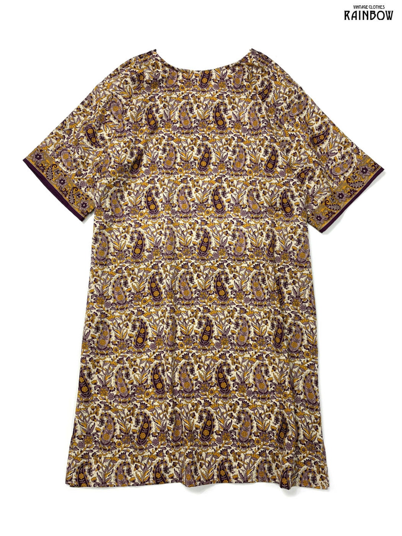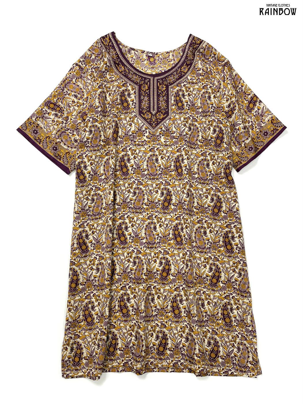#ワンピース #ハーフスリーブ #膝丈 #ストレート #オレンジ #ベージュ #紫 #総柄 #ペイズリー柄 #スリット #エスニック #レーヨン #エスニックワンピース