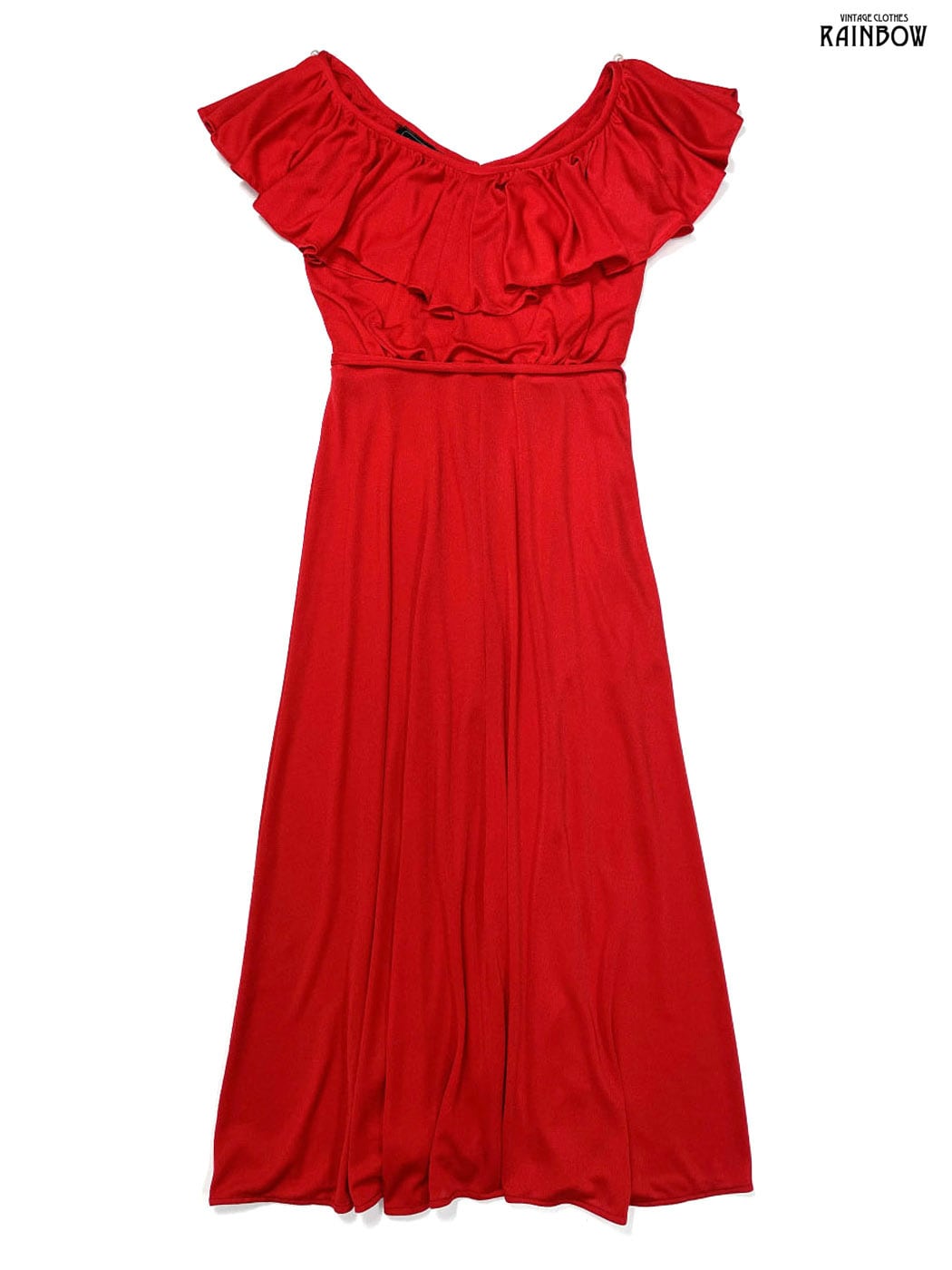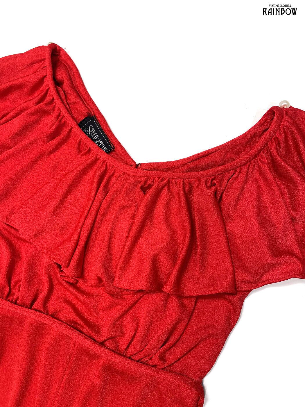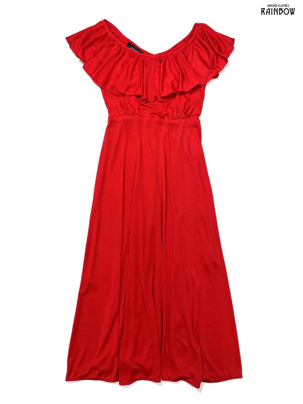 #ワンピース #ノースリーブ #ロング丈 #フレア #赤 #無地 #イングランド製 #フリル #リボン #ベルト付き #パールボタン #ガーリー #ノースリーブ無地ワンピース