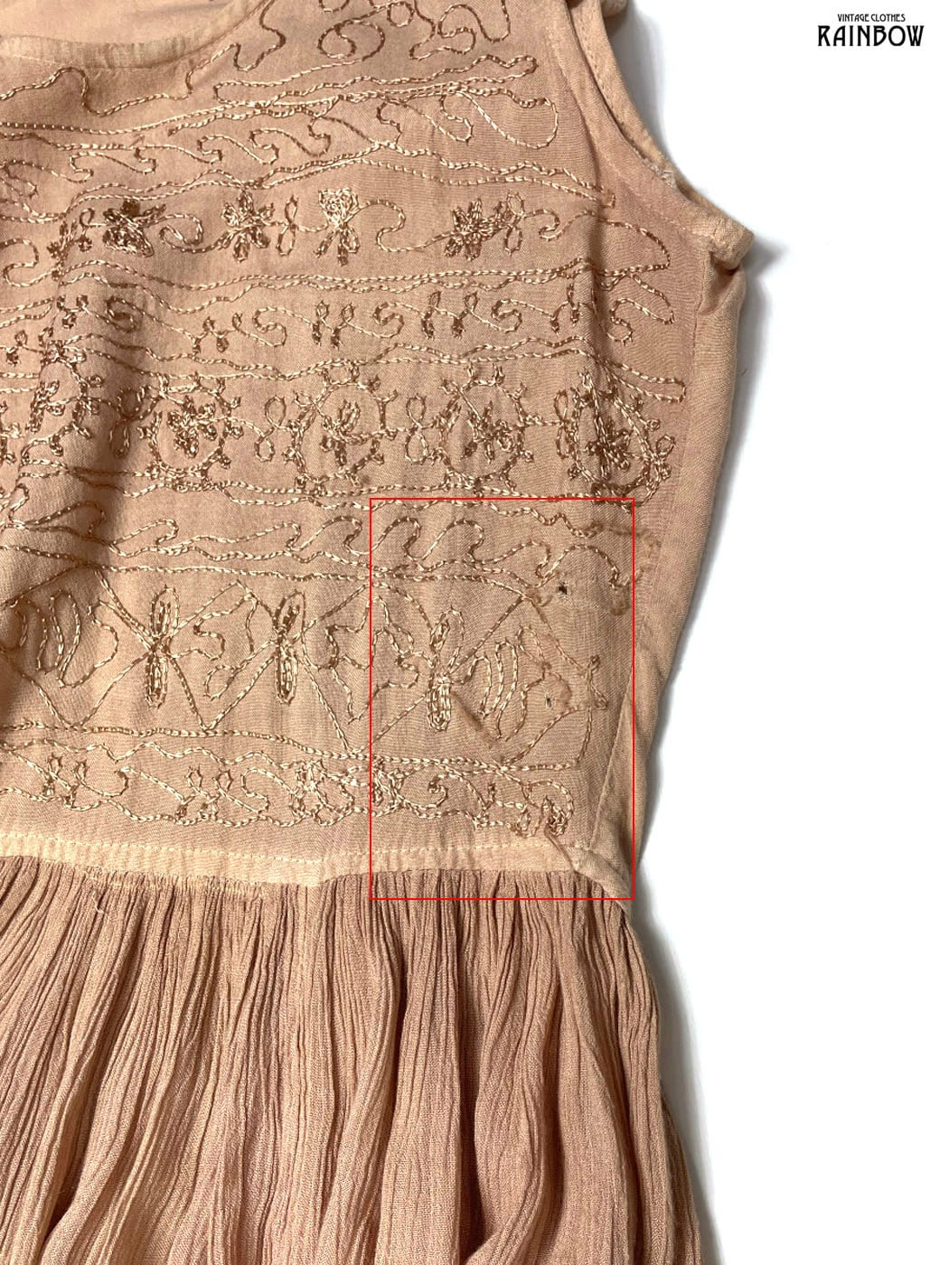 #ワンピース #ノースリーブ #ロング丈 #フレア #ウエスト切り替え #茶 #ベージュ #総柄 #刺繍 #リボン #ヴィンテージ #レーヨン #刺繍ワンピース