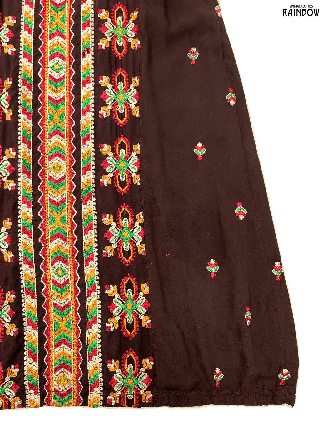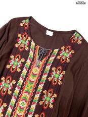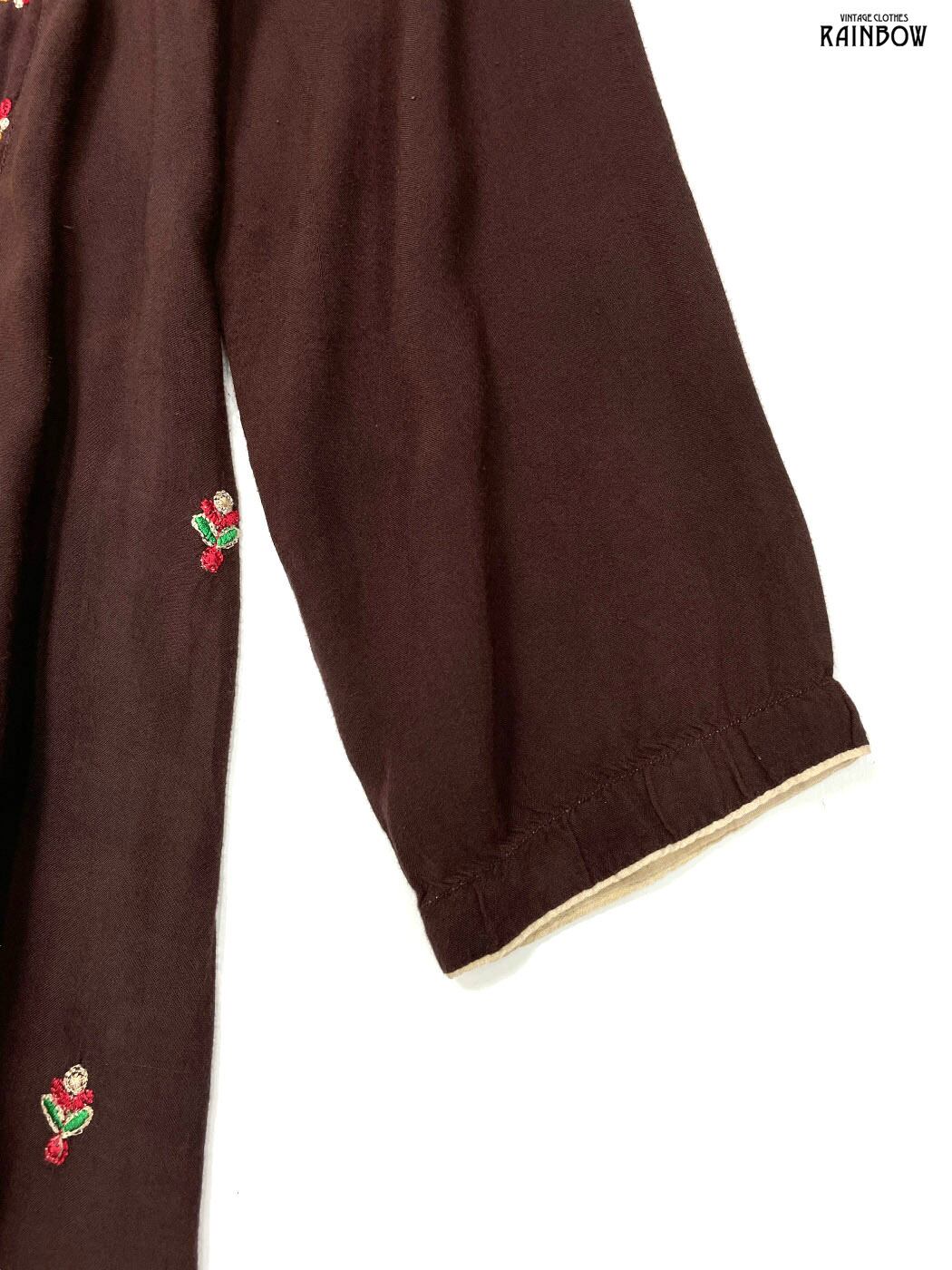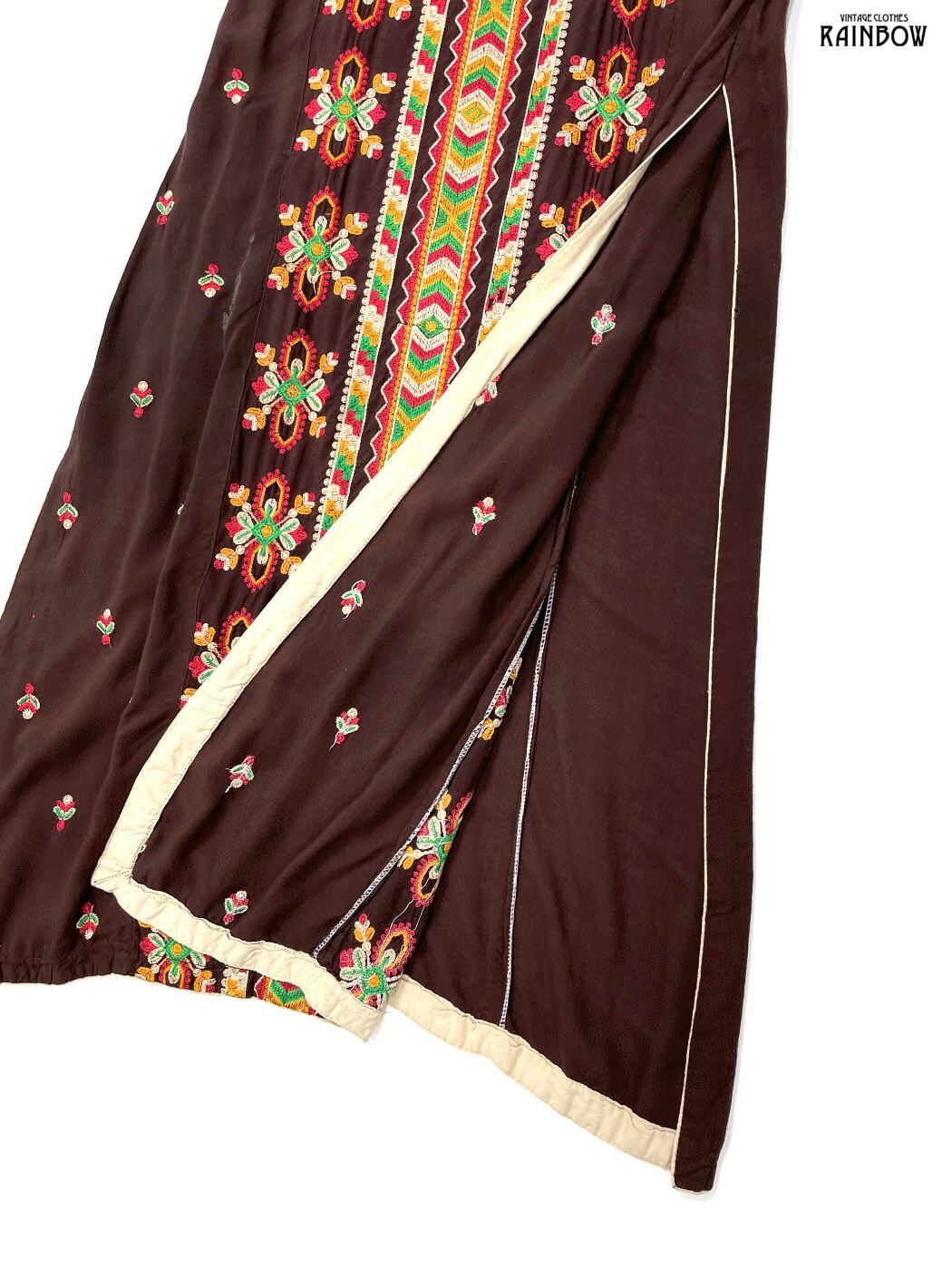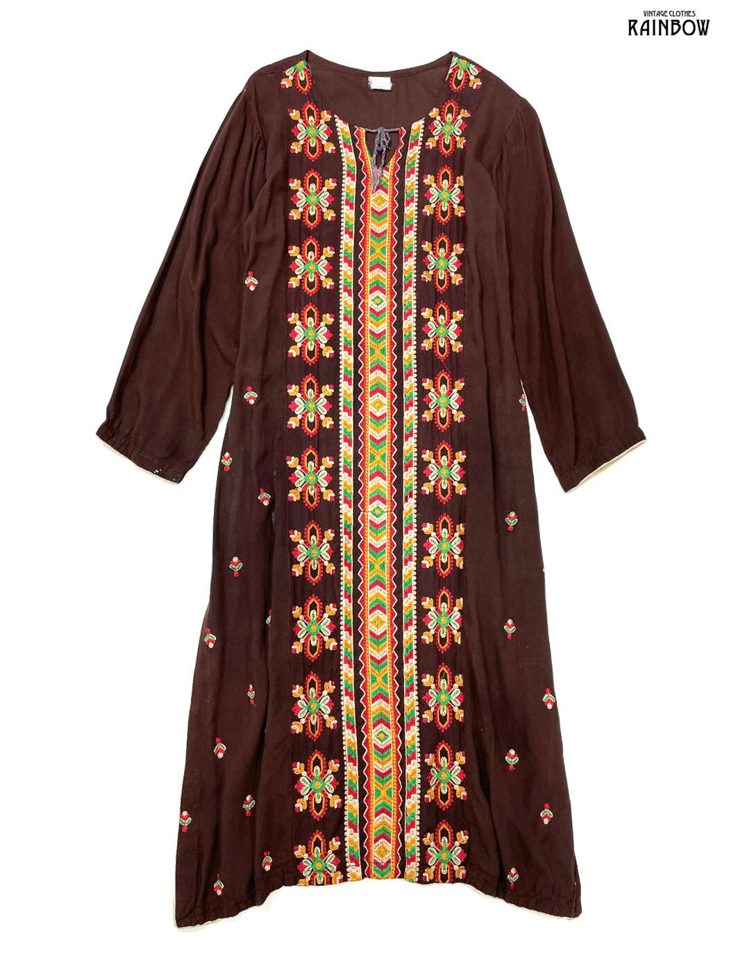#ワンピース #ロングスリーブ #ロング丈 #ストレート #茶 #総柄 #エスニック柄 #刺繍 #リボン #スリット #エスニック #レーヨン #刺繍ワンピース