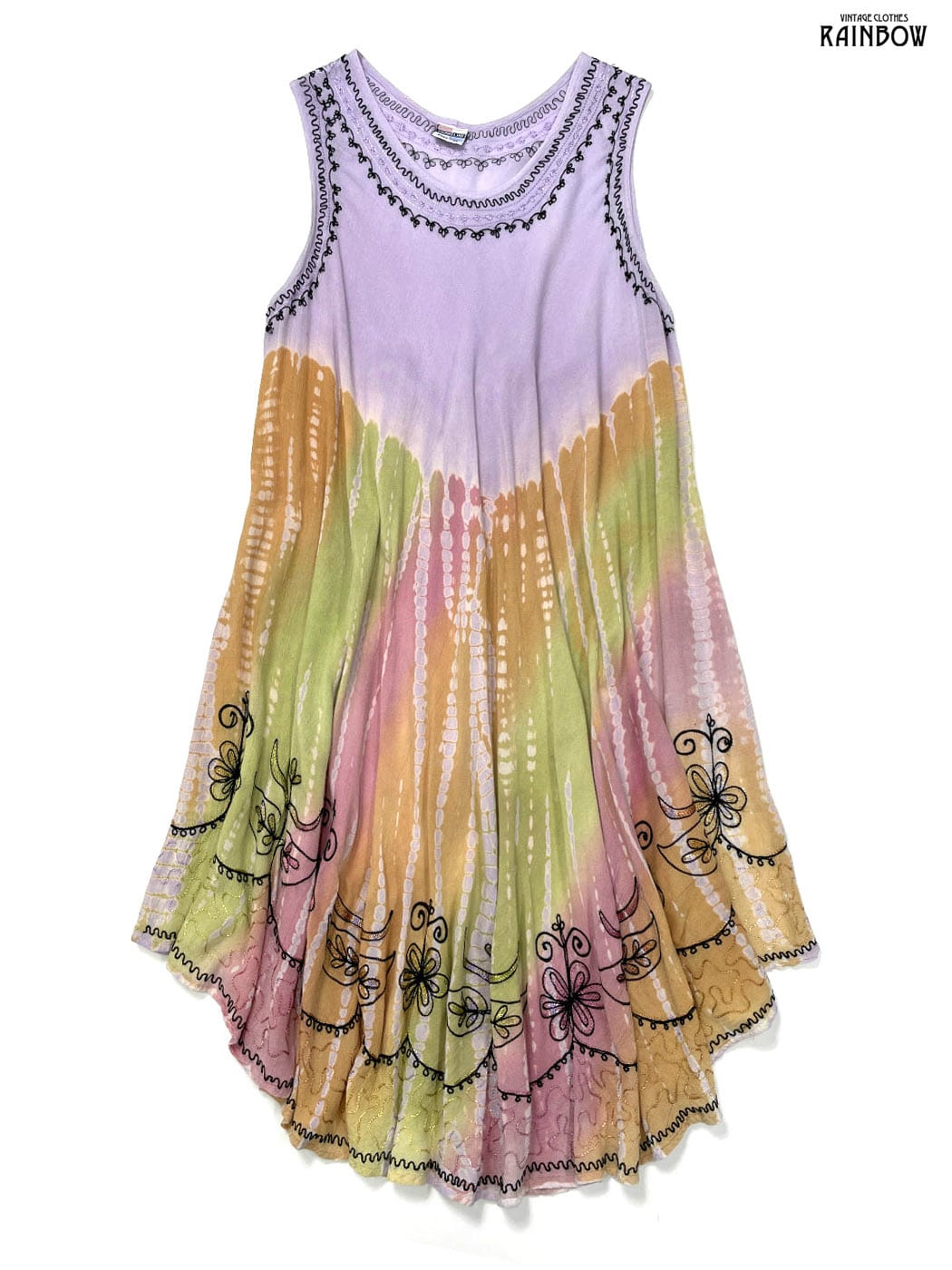 #ワンピース #ノースリーブ #ロング丈 #フレア #ピンク #オレンジ #紫 #総柄 #エスニック柄 #タイダイ染め #刺繍 #エスニック #レーヨン #刺繍ワンピース