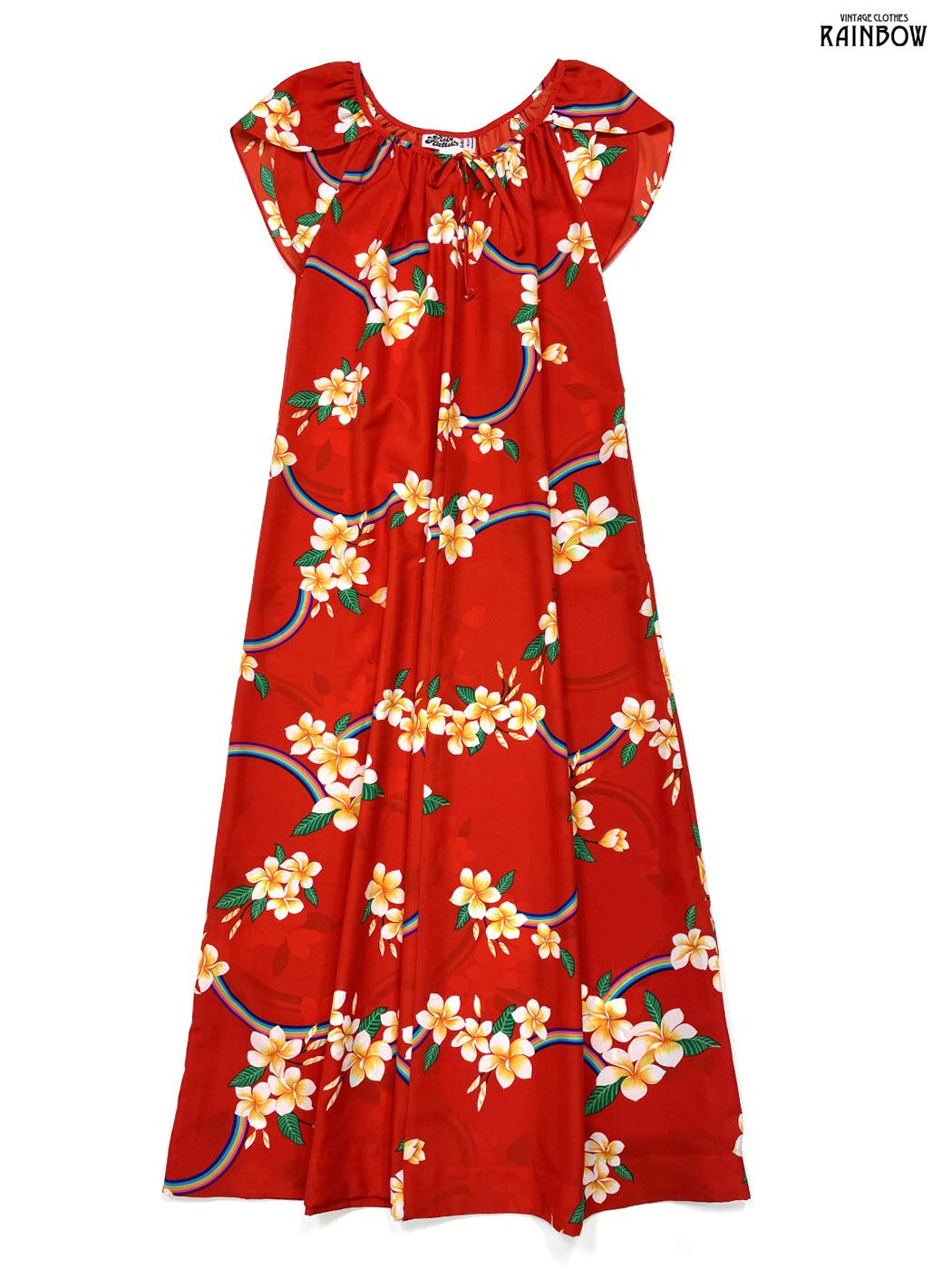 #ワンピース #ハーフスリーブ #ロング丈 #フレア #茶 #花柄 #アロハ柄 #虹 #プルメリア #アメリカ製, #リボン ハワイ #ヴィンテージ #半袖花柄ワンピース