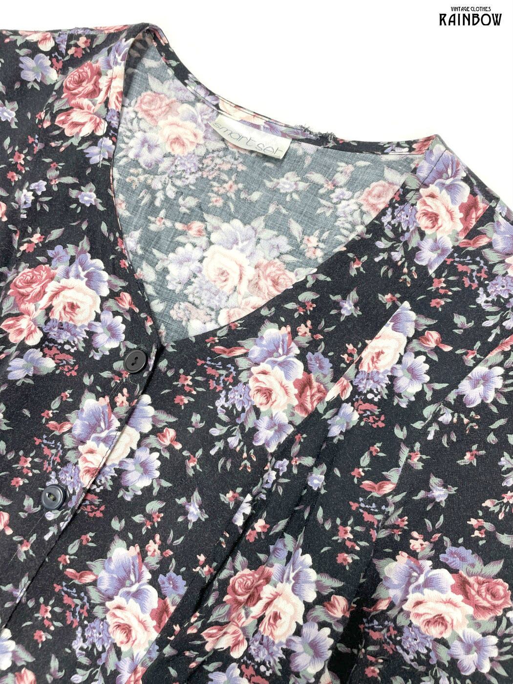 #ワンピース #ハーフスリーブ #ロング丈 #フレア #黒 #ピンク #花柄 #リボン #編み上げリボン #クラシック #レーヨン #半袖花柄ワンピース