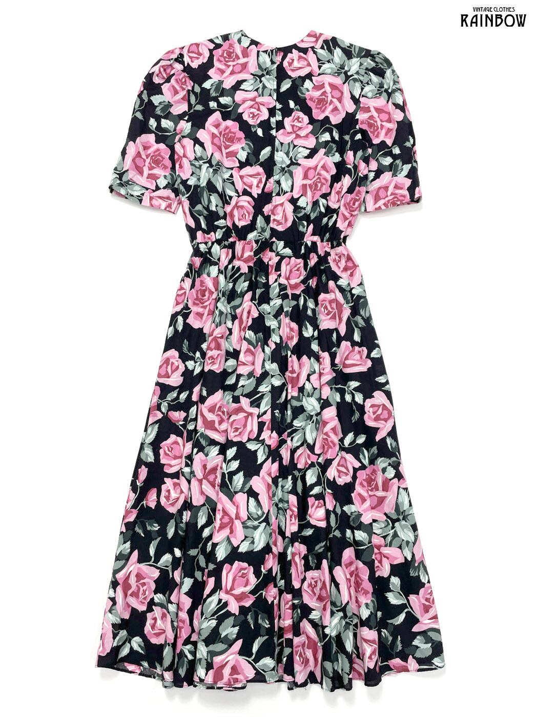 #ワンピース #ハーフスリーブ #ロング丈 #フレア #ゴムウエスト #ウエスト切り替え #黒 #ピンク #花柄 #クラシック #コットン #半袖花柄ワンピース #パフスリーブ