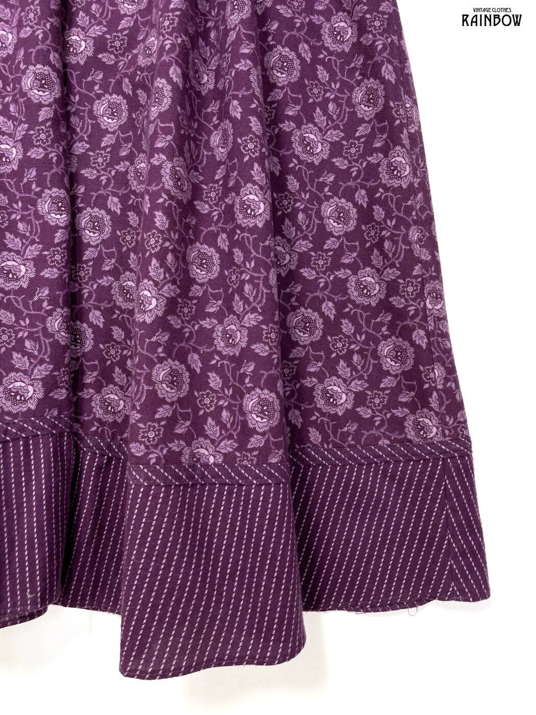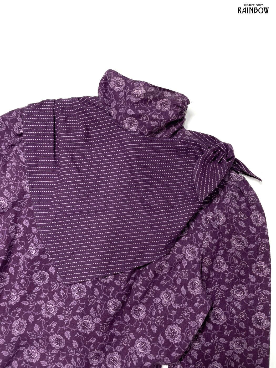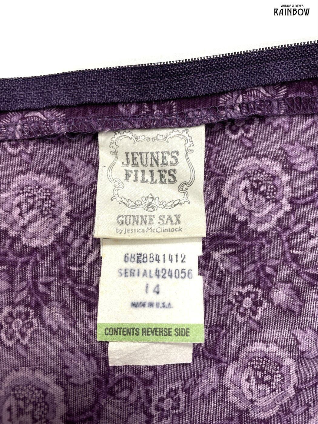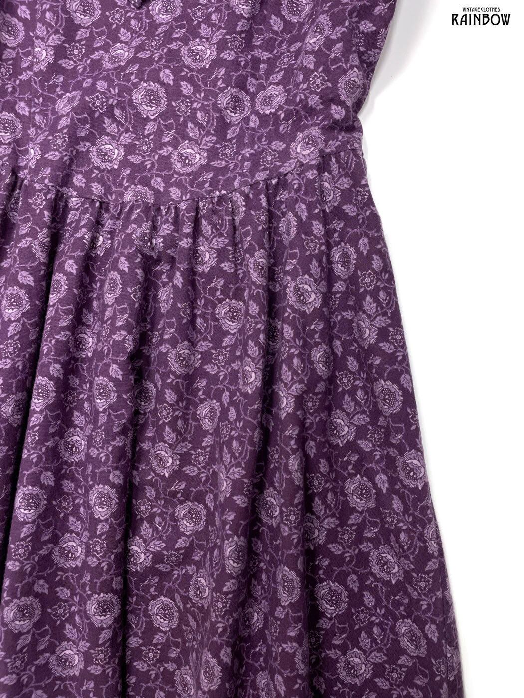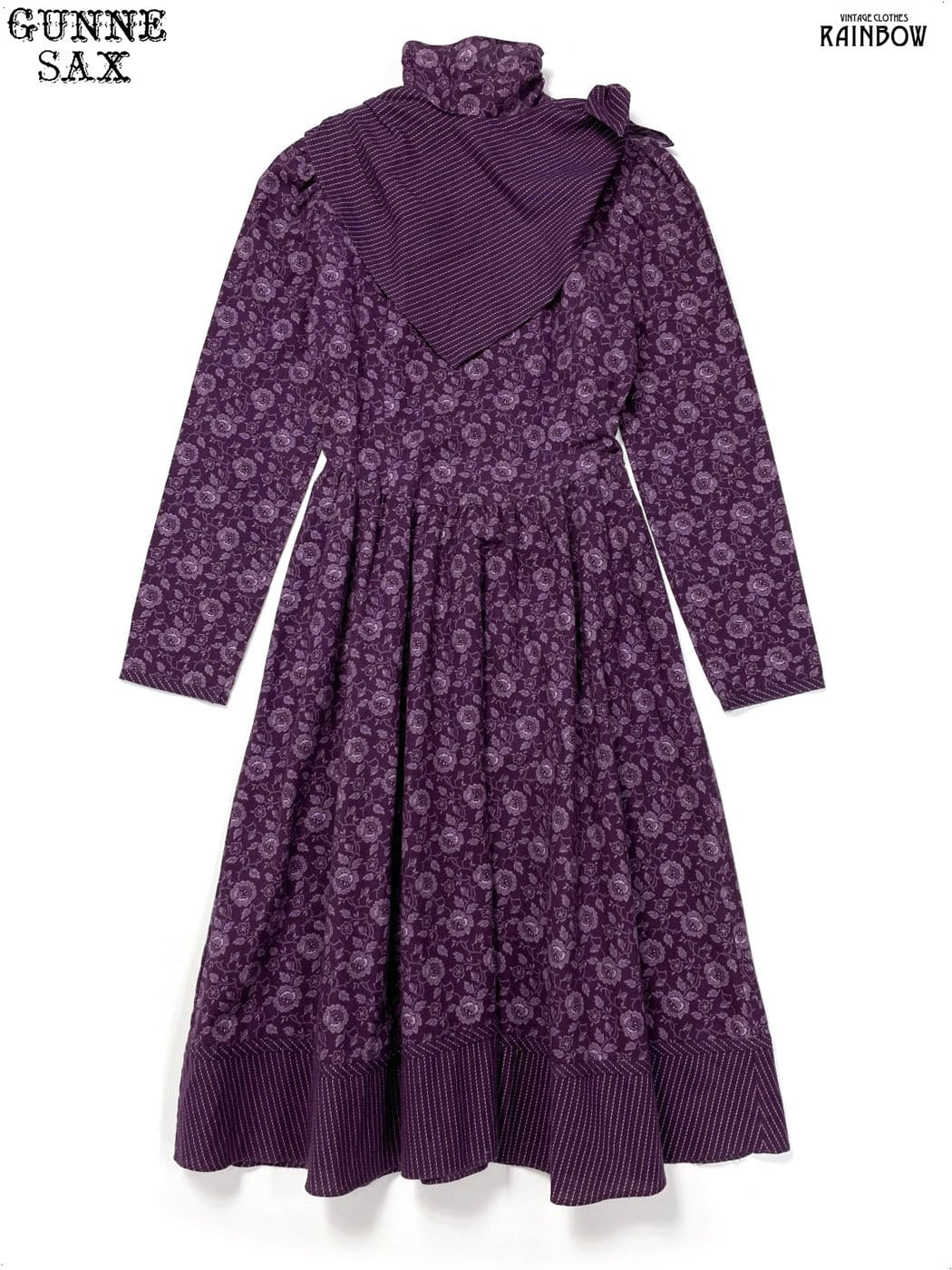 古着 JEUNES FILLES GUNNE SAX スカーフ風 アメリカ製 ハイネック リボン 花柄 コットン ロング丈 長袖 ワンピース 紫 (otu2408161)