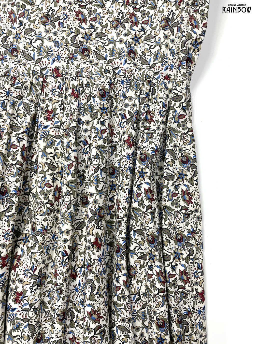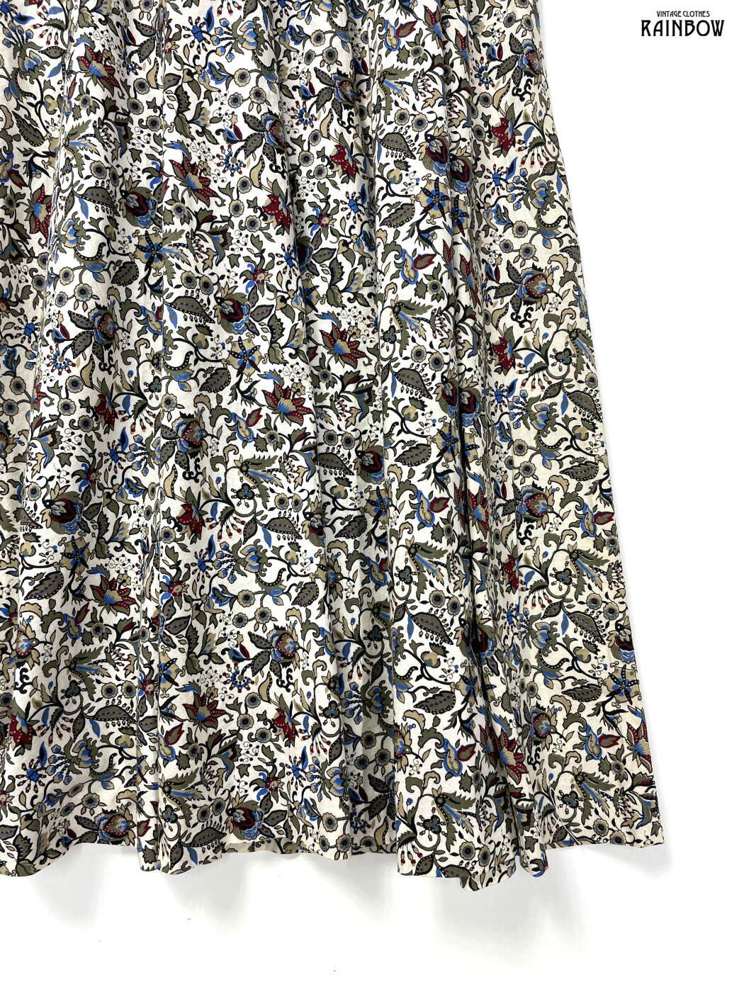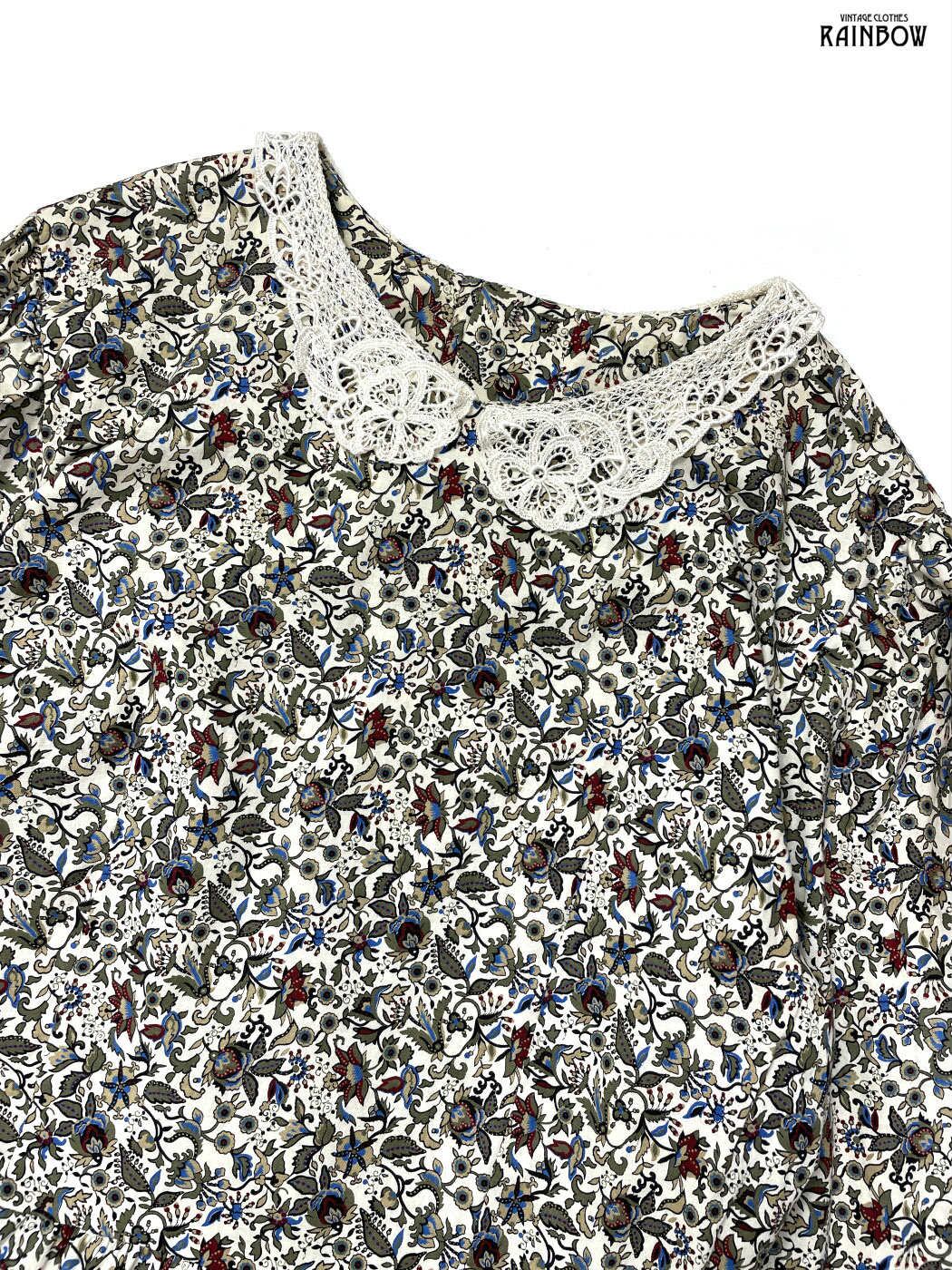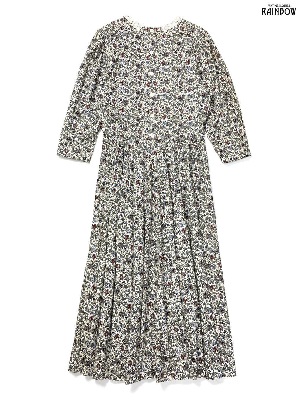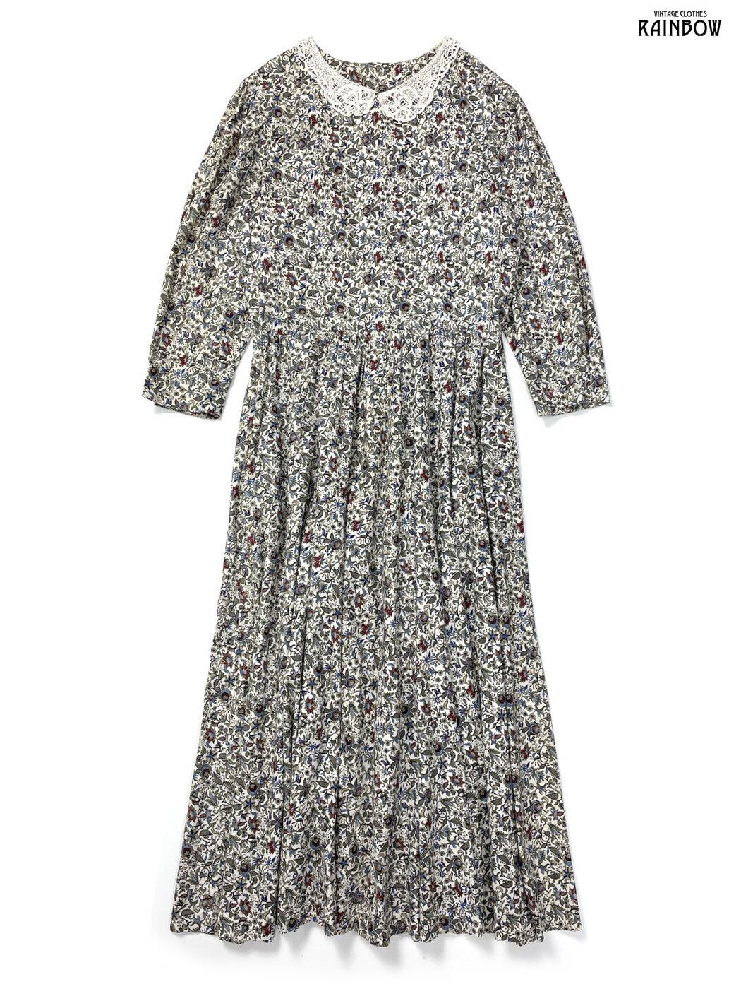 #ワンピース #ロングスリーブ #ロング丈 #フレア #ウエスト切り替え #ベージュ #生成り #花柄 #アメリカ製 #レース #ガーリー #コットン #長袖花柄ワンピース