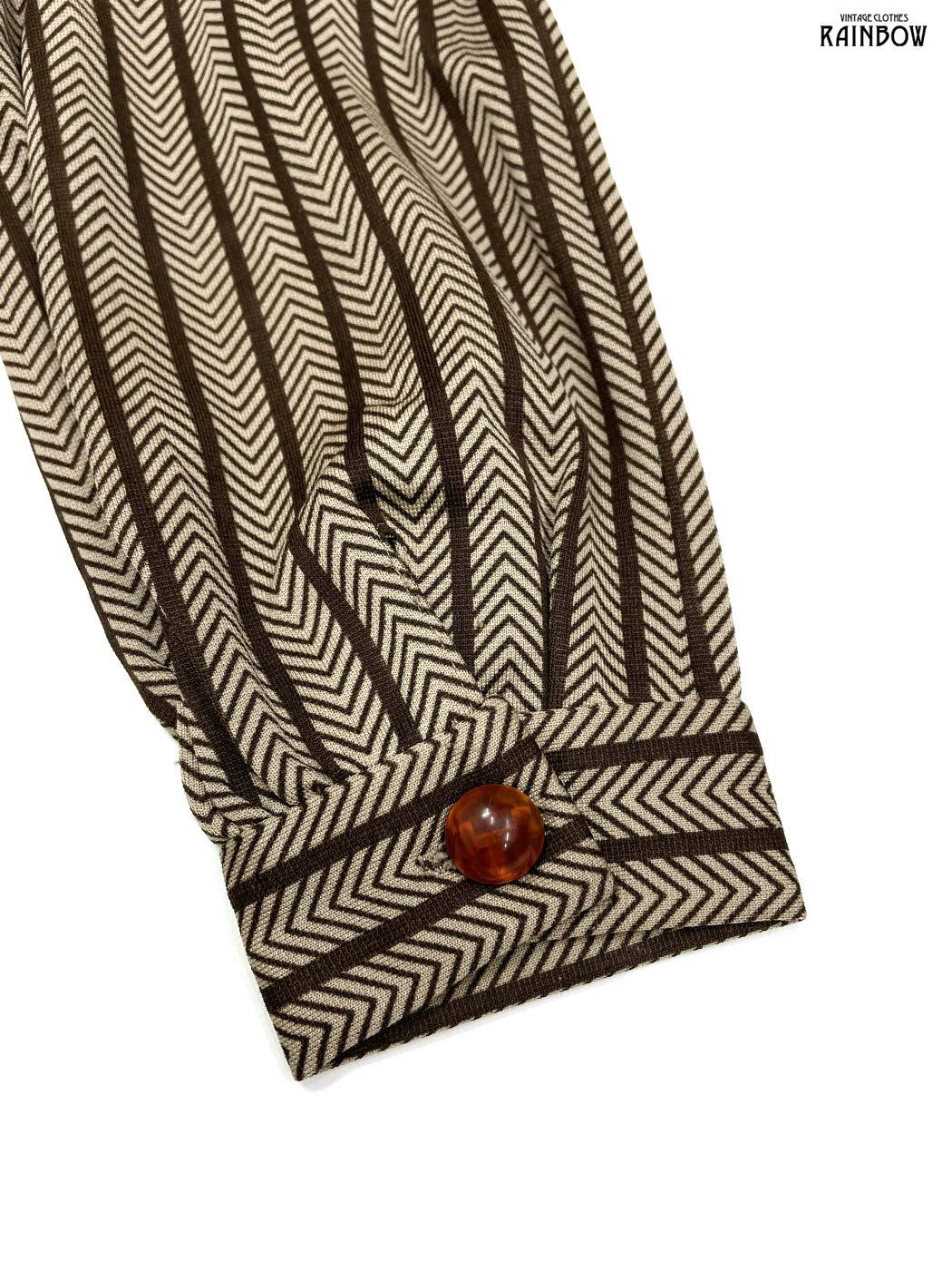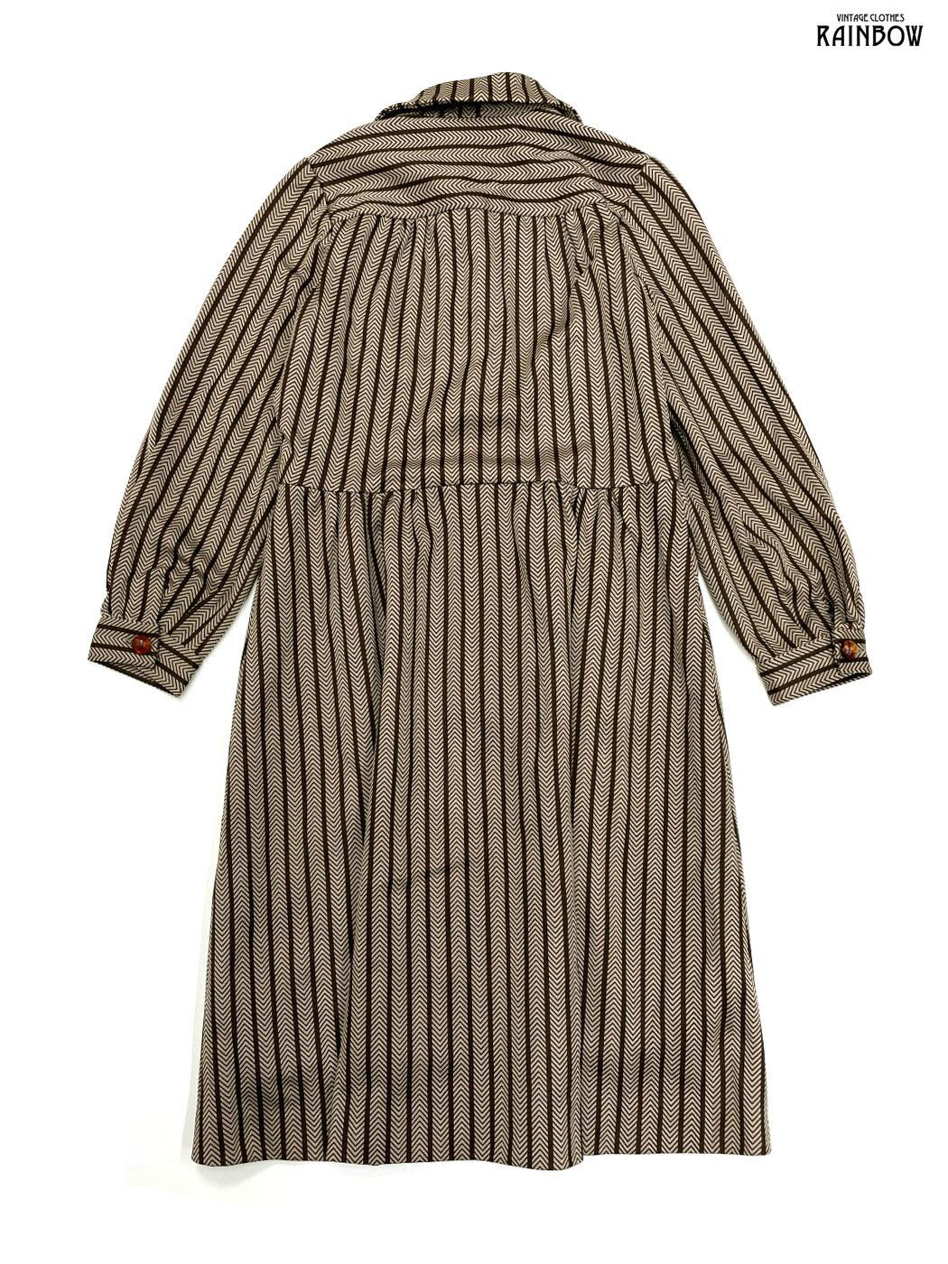 #ワンピース #ロングスリーブ #ウエスト切り替え #茶 #ストライプ柄 #総柄 #前開き #クラシック #前開きシャツワンピース