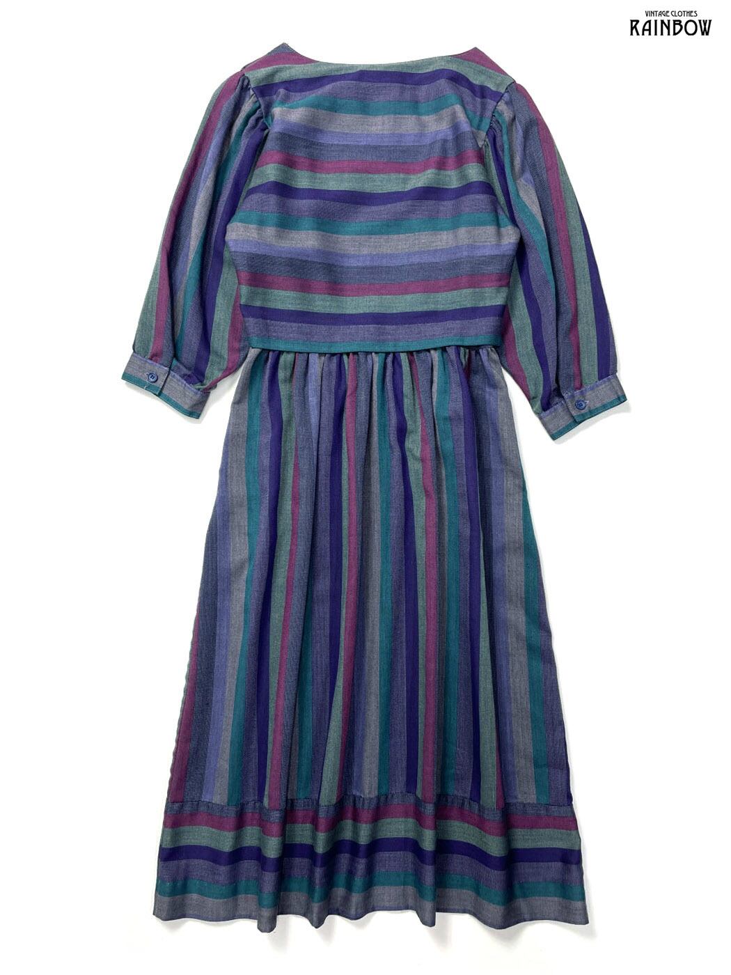 #ワンピース #ロングスリーブ #ロング丈 #ウエスト切り替え #青 #紫 #ボーダー柄 #ストライプ柄 #コットン #長袖ストライプ柄ワンピース