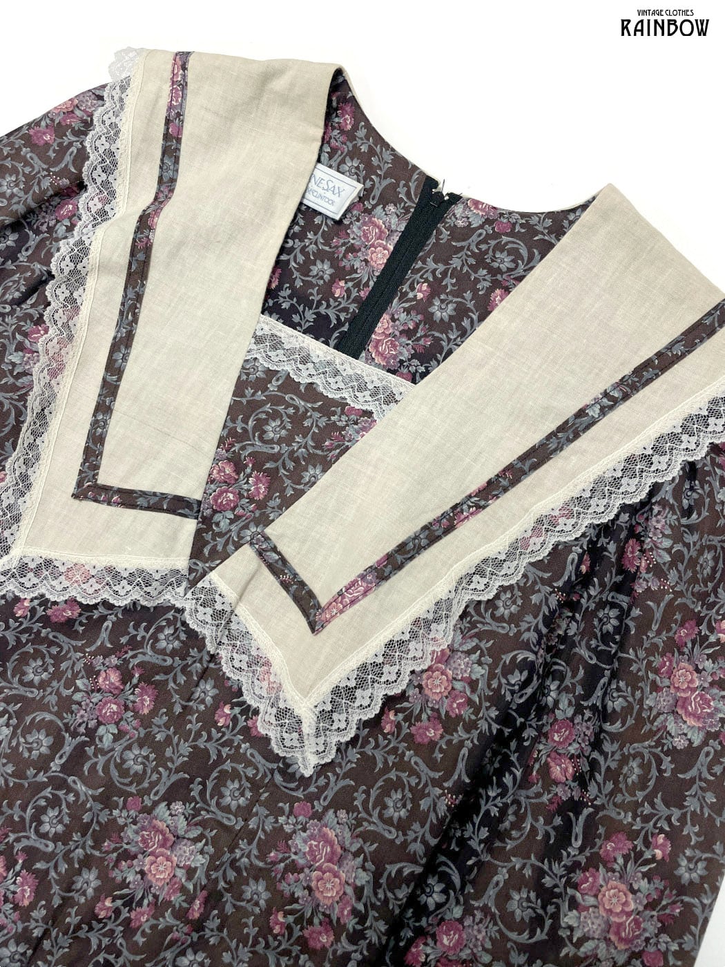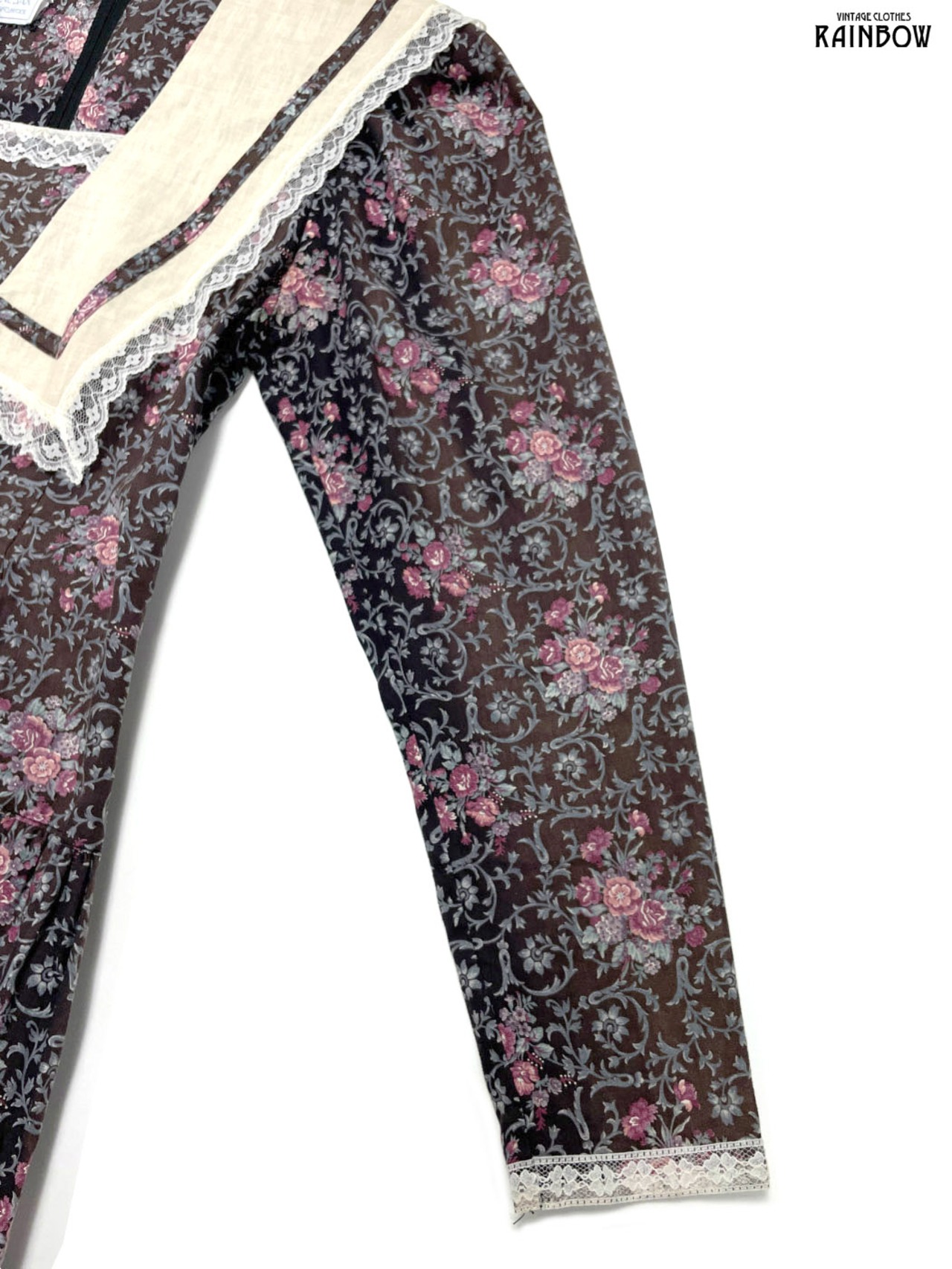 #ワンピース #ロングスリーブ #ロング丈 #フレア #ウエスト切り替え #茶 #花柄 #レース #ビッグカラー #セーラーカラー #ガーリー #コットン #長袖花柄ワンピース