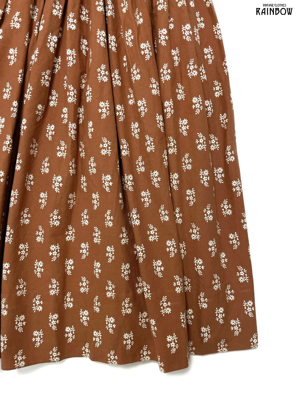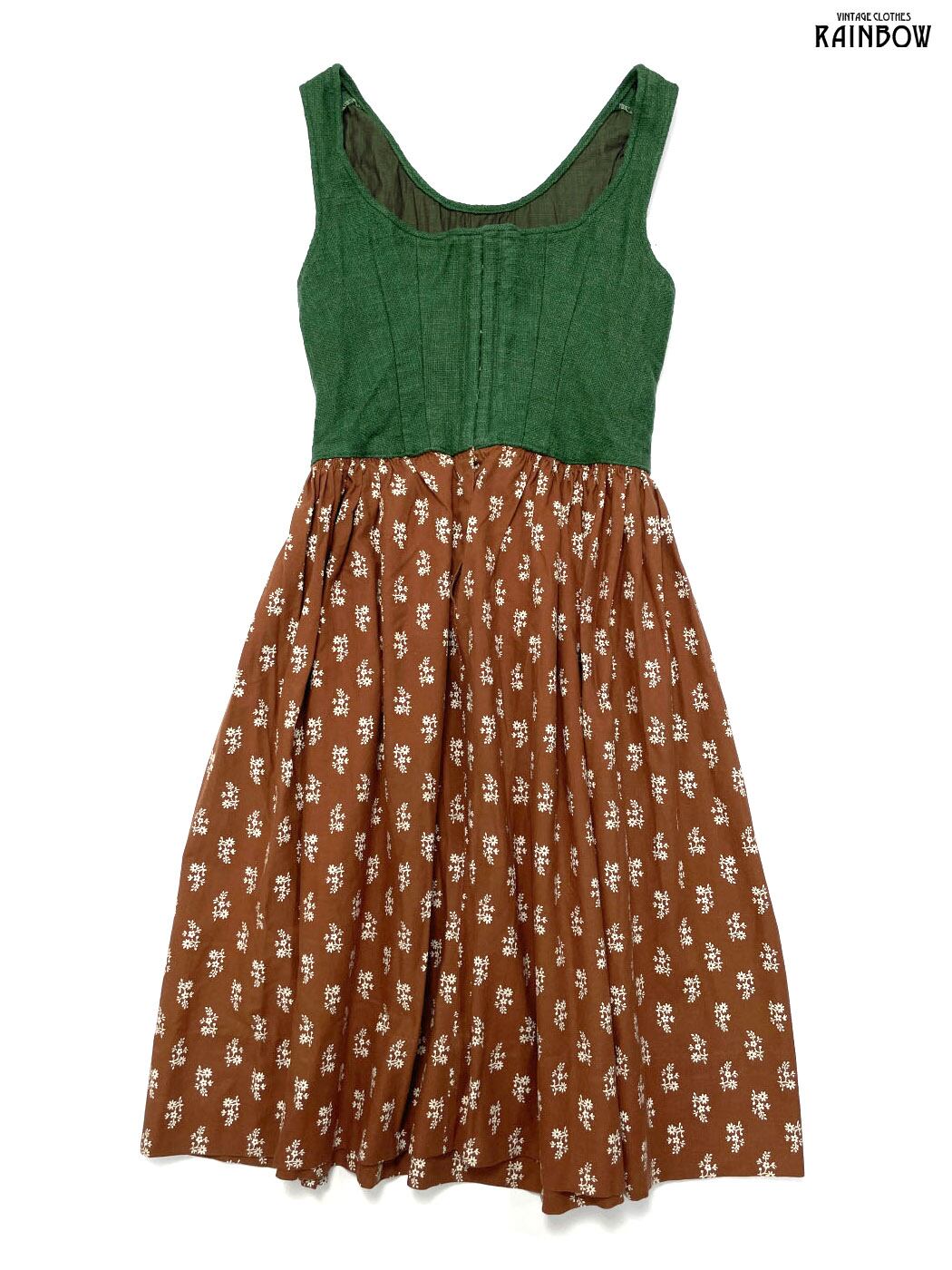 #ワンピース #ノースリーブ #膝丈 #フレア #ウエスト切り替え #茶 #緑 #花柄 #コルセット風 #ヴィンテージ #コットン #ノースリーブ花柄ワンピース