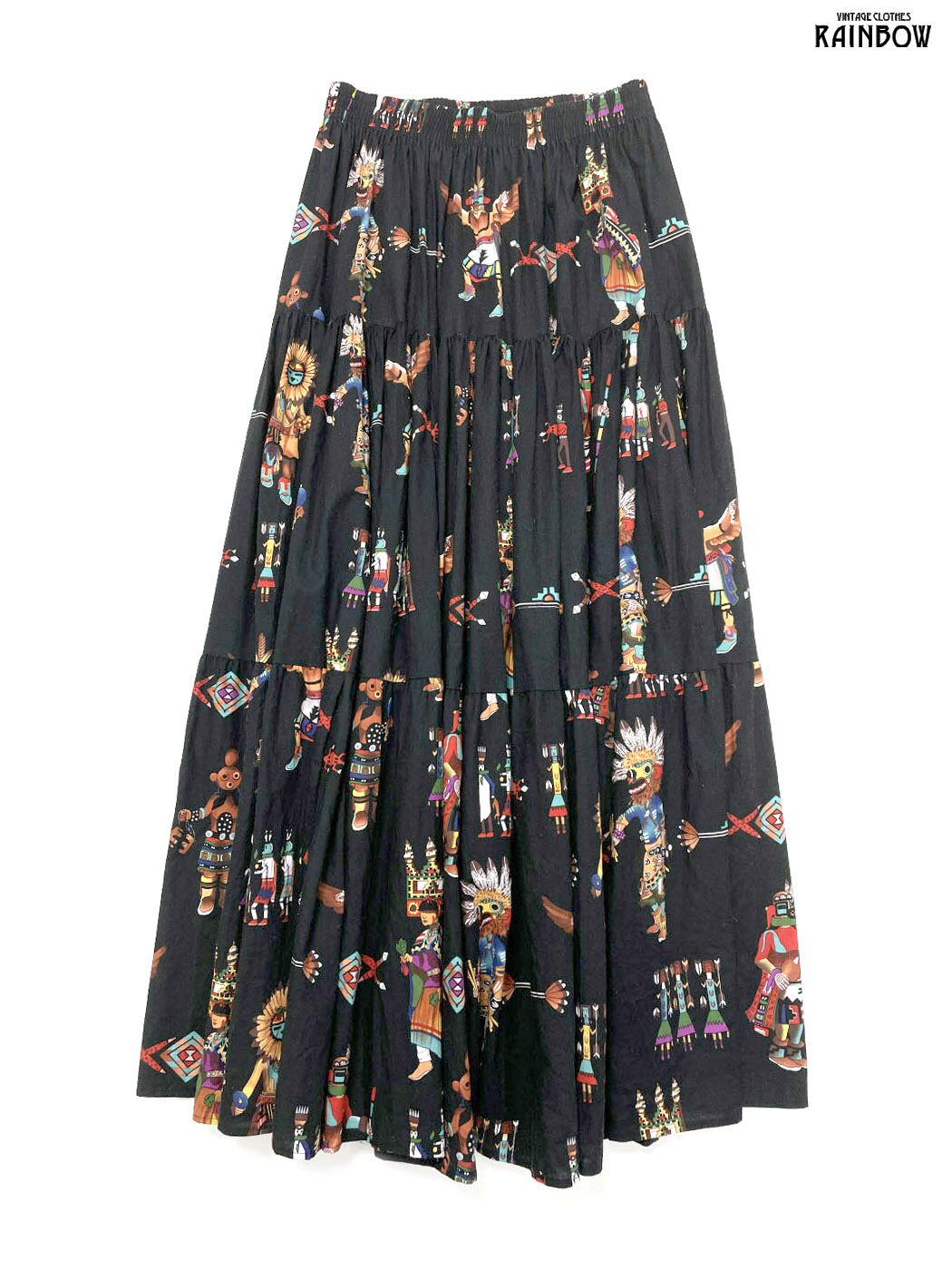 古着 アメリカ製 総柄 エスニック柄 コットン100% ロング丈 ティアード スカート 黒 (btu2502010)