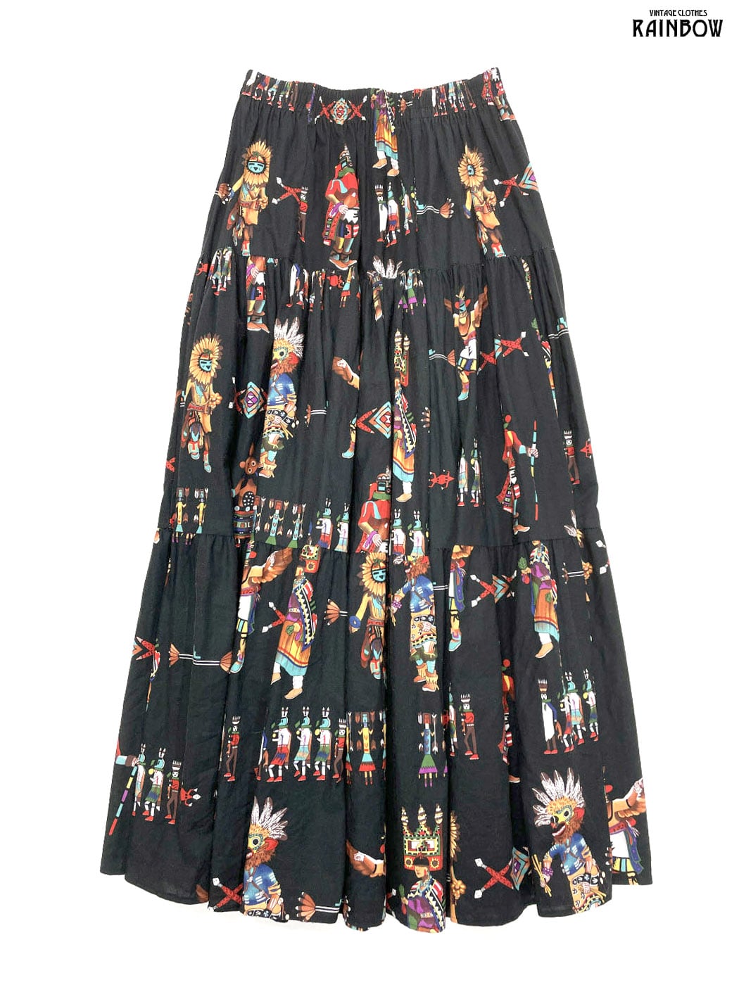 #スカート #ロング丈 #フレア #ティアード #ゴムウエスト #黒 #総柄 #エスニック柄 #アメリカ製 #エスニック #コットン #エスニックスカート