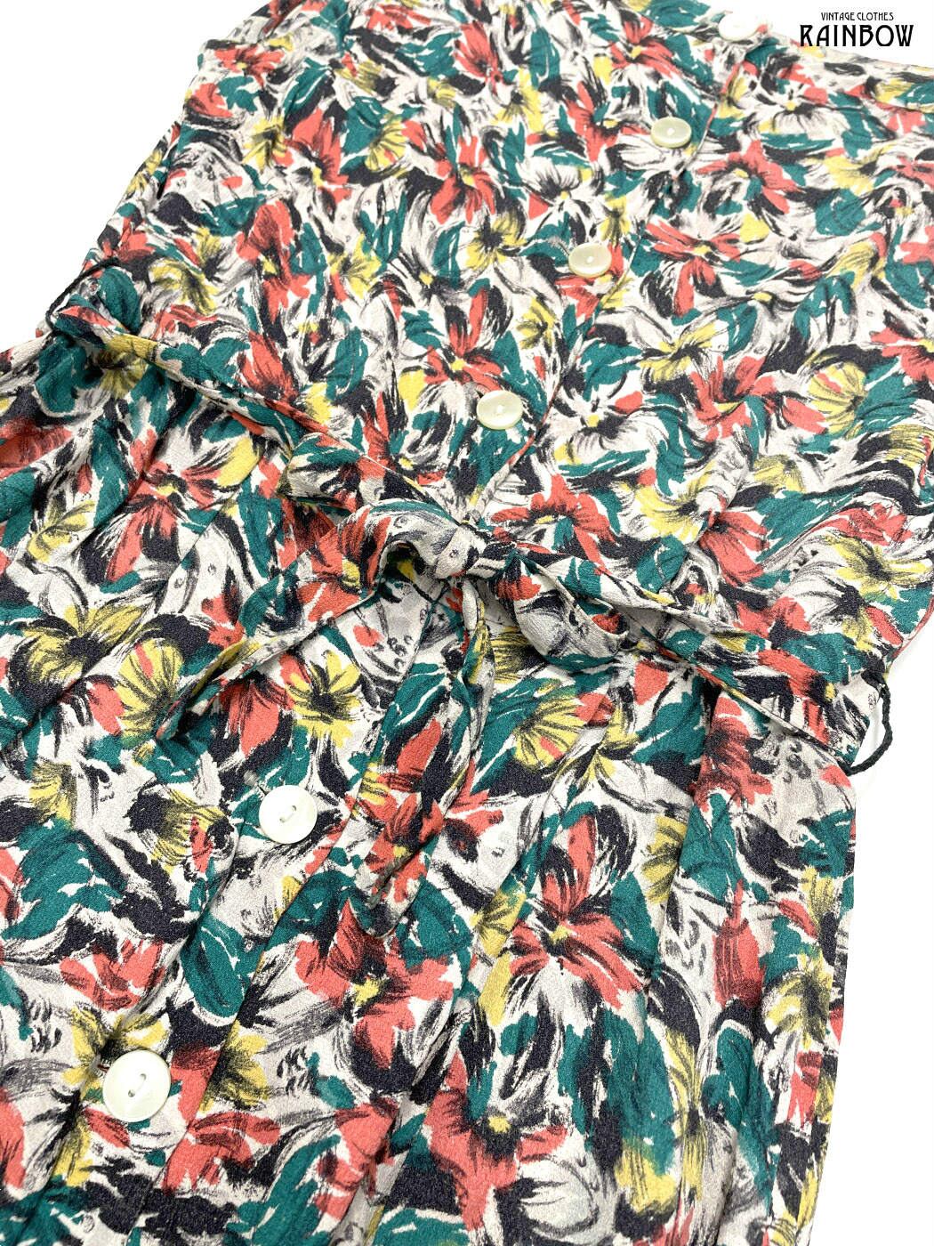 #ワンピース #ノースリーブ #ロング丈 #フレア #ウエスト切り替え #オレンジ #ベージュ #緑 #花柄 #リボン #前開き #ガーリー #ノースリーブ花柄ワンピース