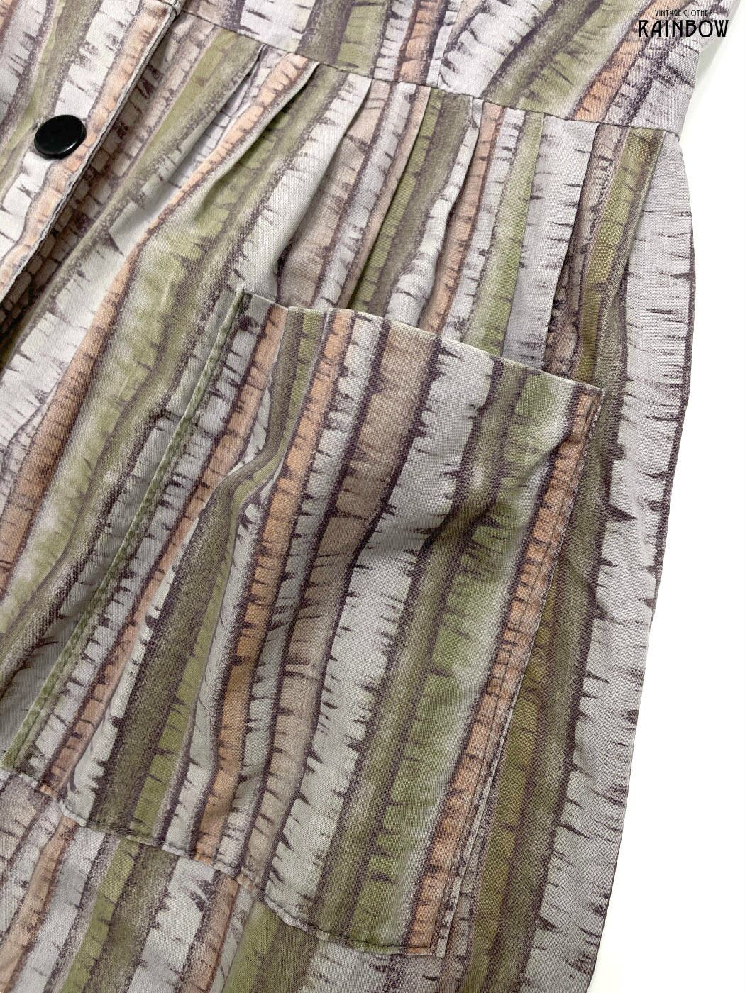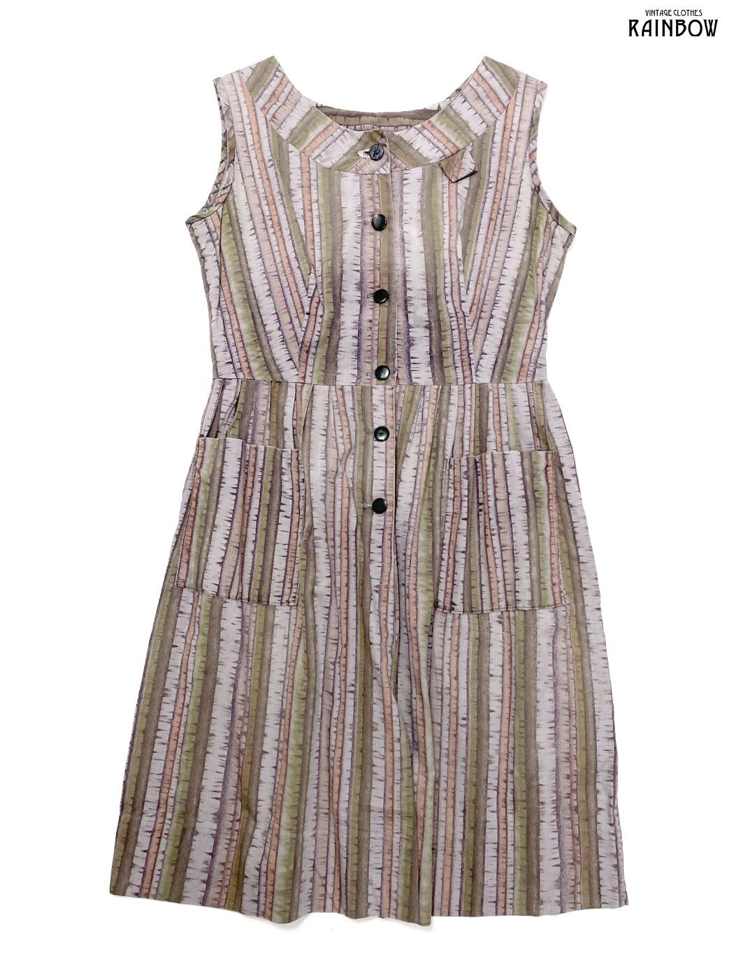 #ワンピース #ノースリーブ #膝丈 #フレア #ウエスト切り替え #紫 #カーキ #総柄 #アメリカ製 #前開き #クラシック #コットン #ノースリーブ総柄ワンピース