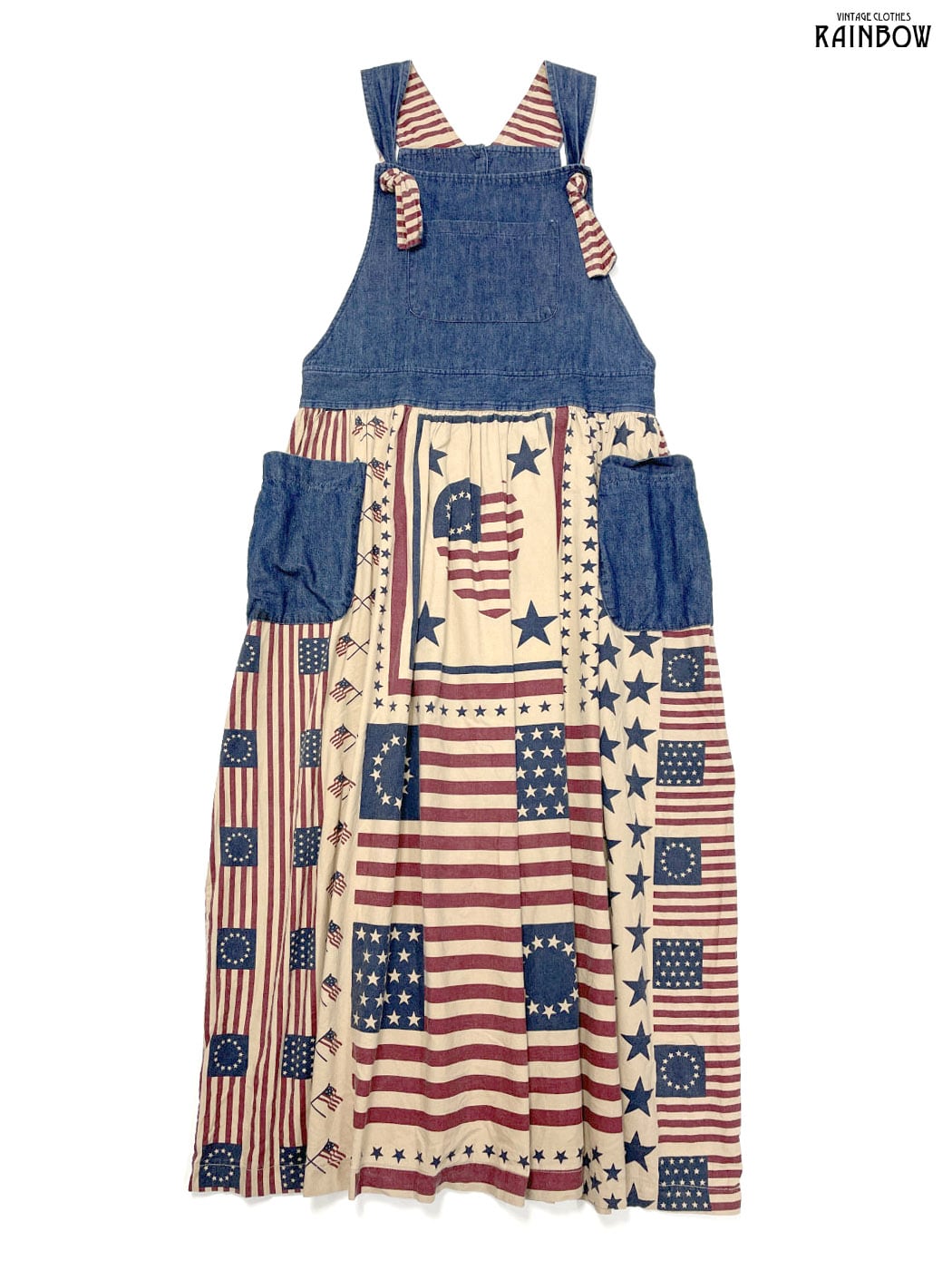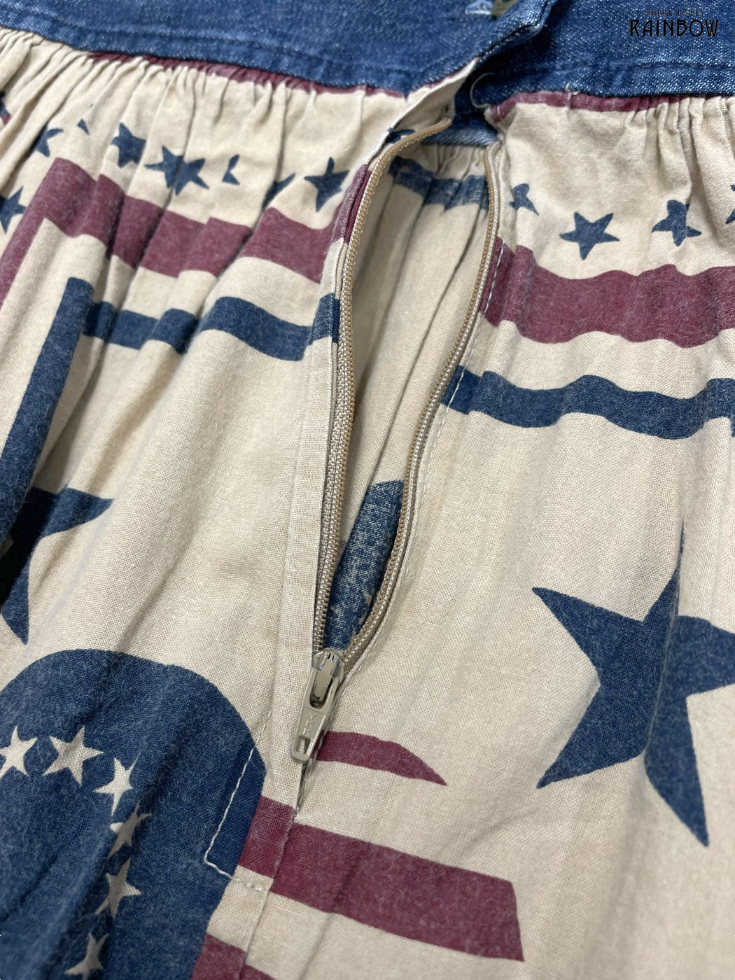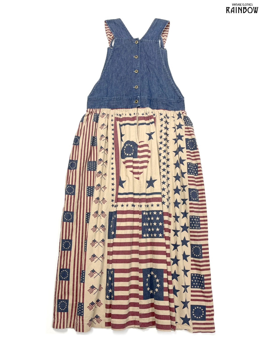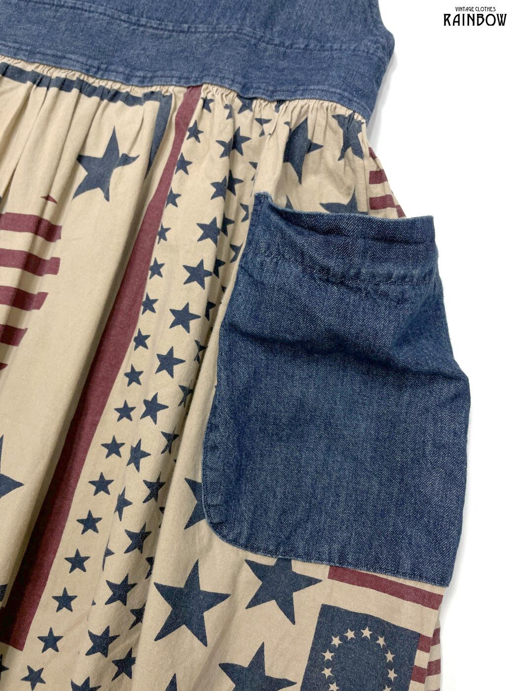 古着 WILLOWBEND 星柄 国旗柄 アメリカ製 総柄 デニム ロング丈 キャミソール ワンピース 青ベージュ (otu2502096)