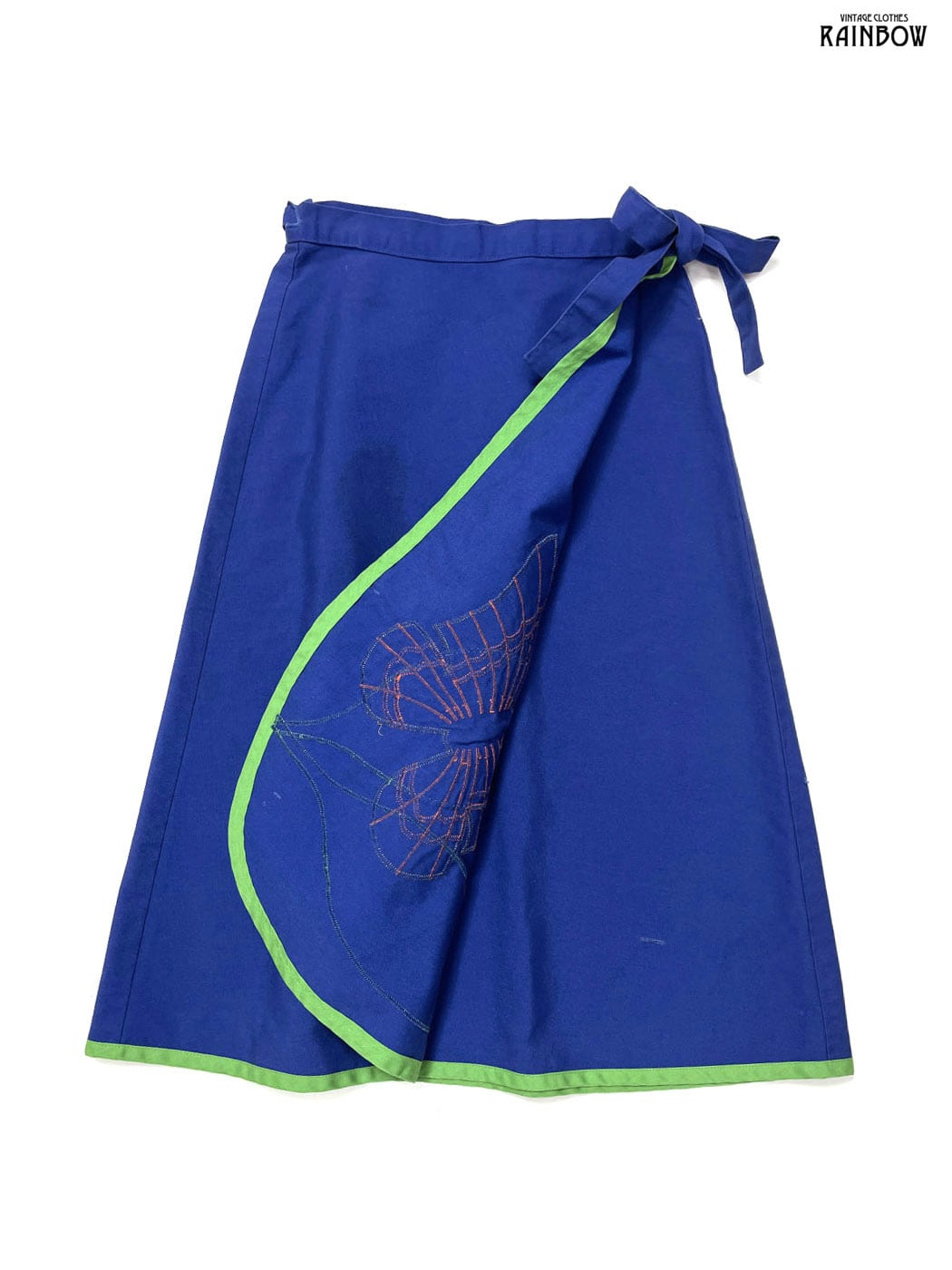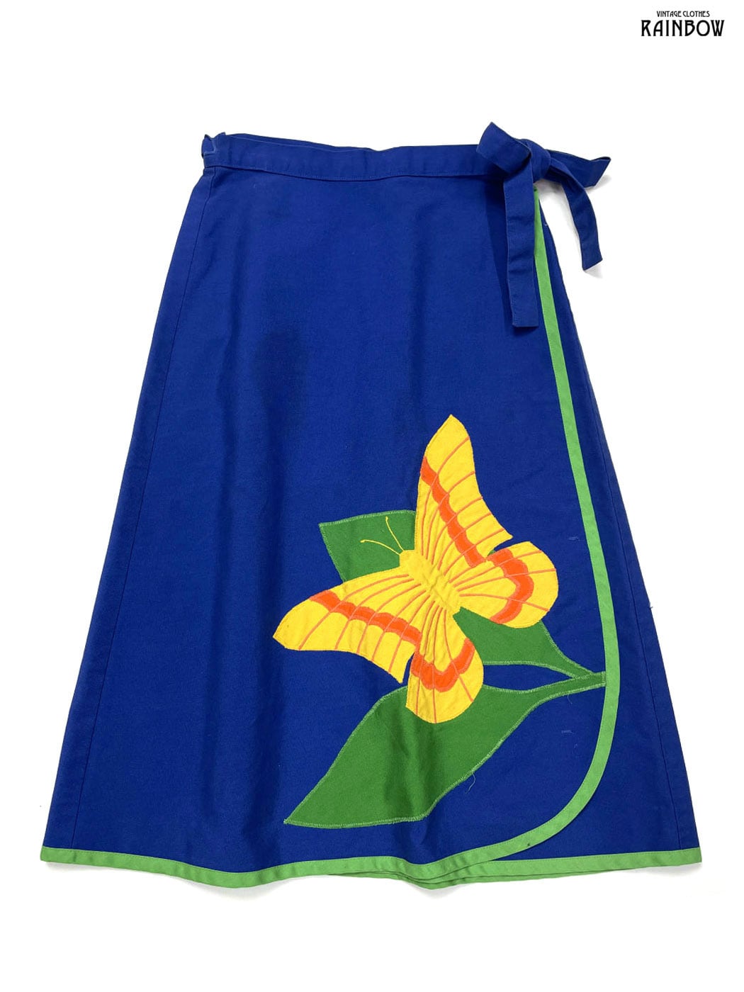 古着 アップリケ 蝶 刺繍 総柄 コットン 膝丈 スカート 青 (btu2502050)