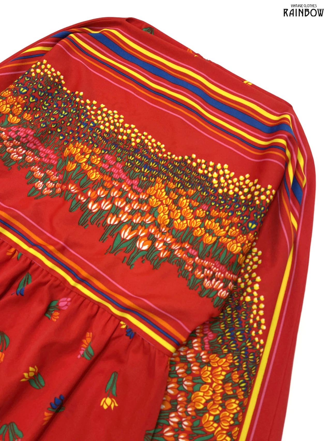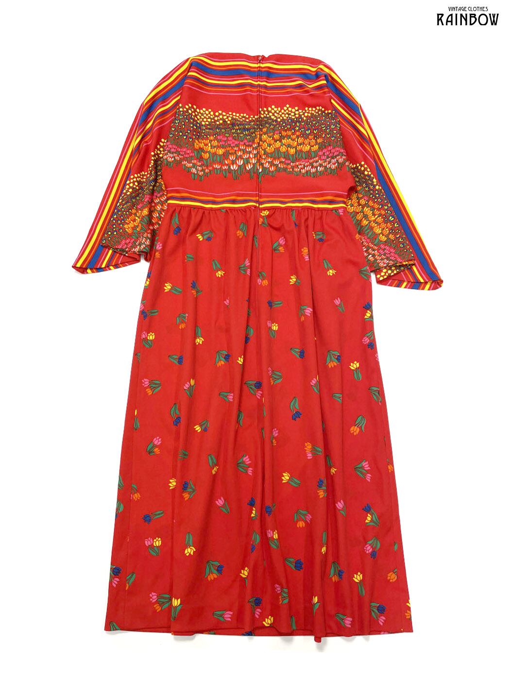 #ワンピース #ロングスリーブ #ロング丈 #フレア #ウエスト切り替え #赤 #花柄 #TALONジップ #ボートネック #着物スリーブ #ガーリー #長袖花柄ワンピース